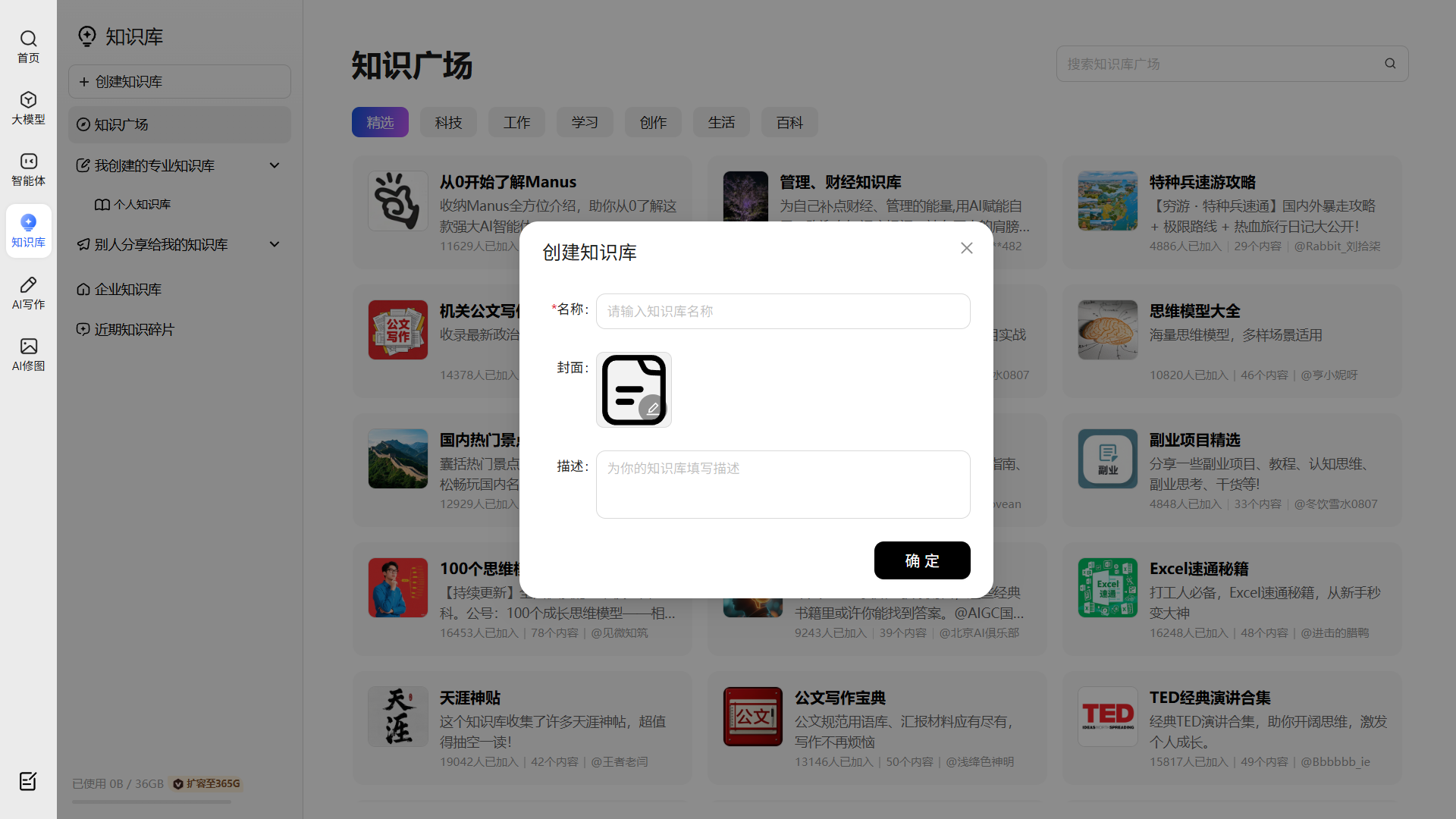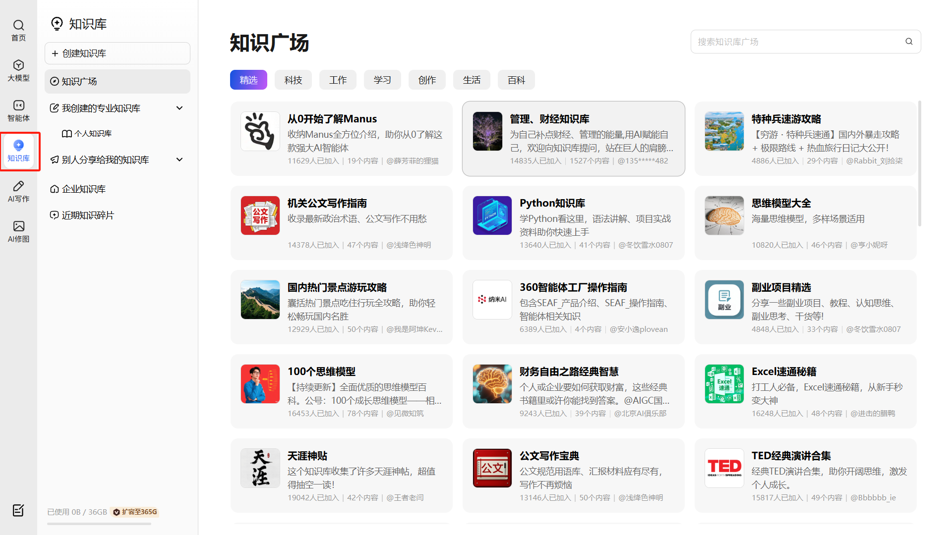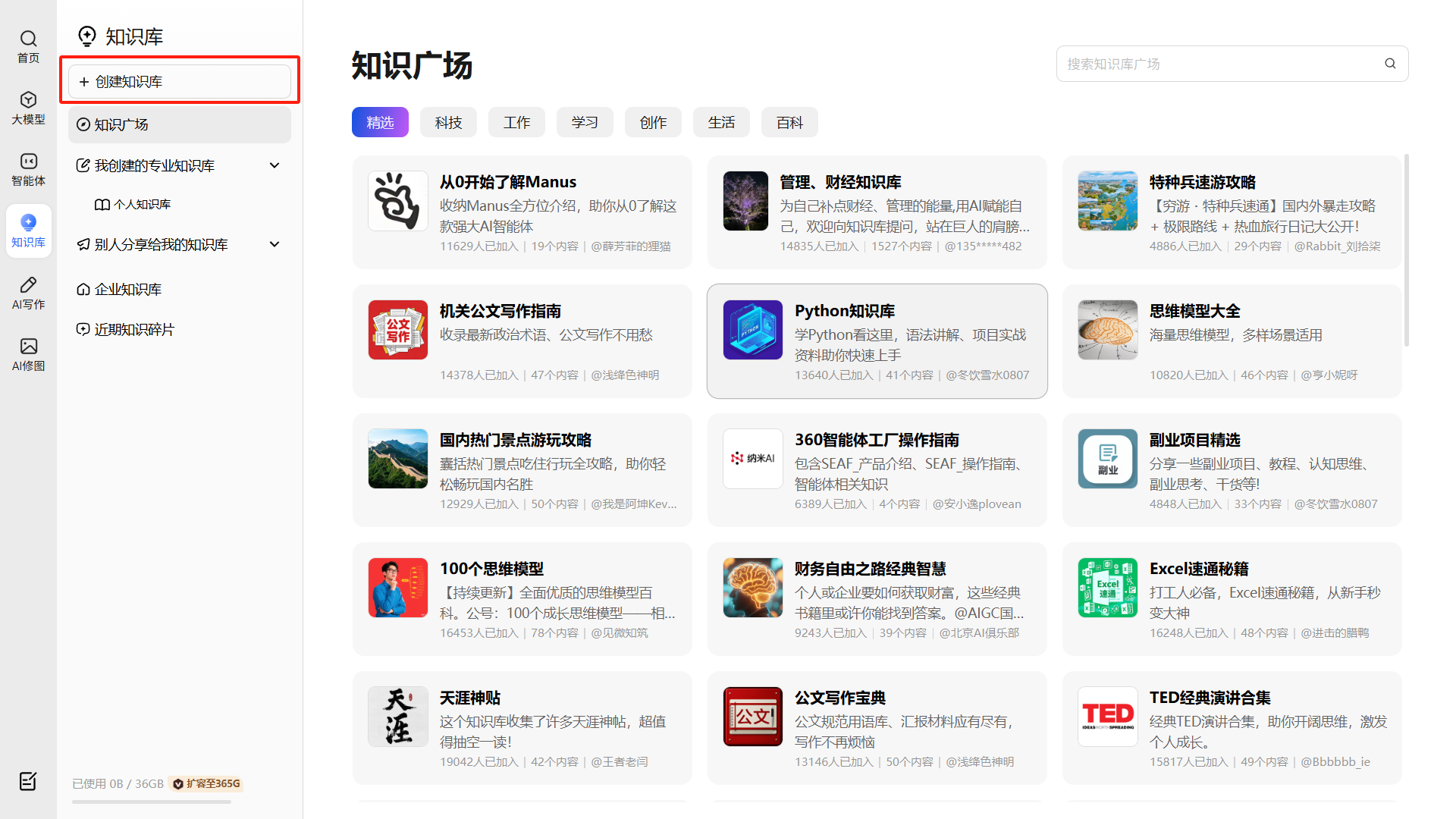 右侧「知识广场」展示平台上的公开知识库,分为精选、科技、工作、学习、创作、生活、百科等分类,热门知识库如:
