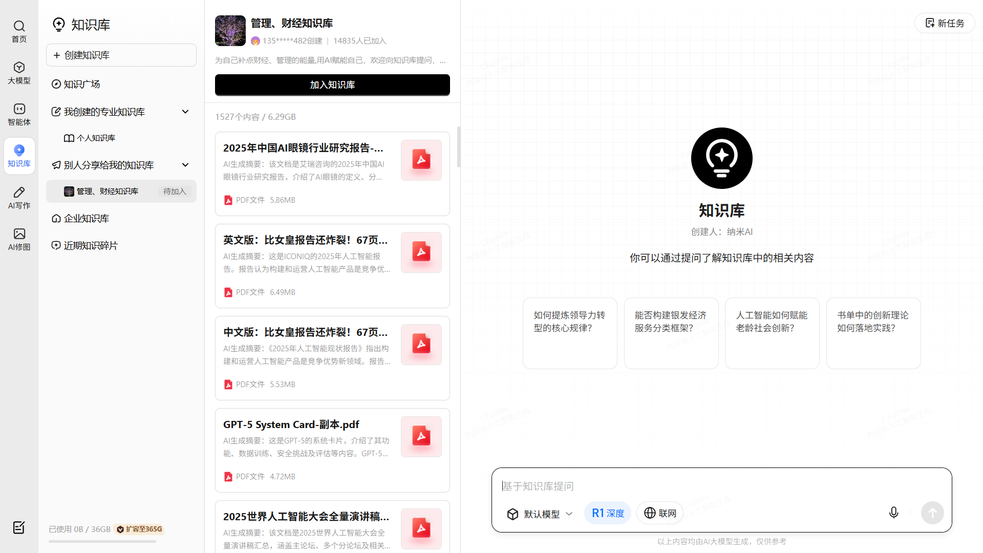 点击左侧边栏的「知识库」进入知识库管理页面。这是纳米AI最具差异化的功能之一——你可以把自己的文档、资料"喂"给AI,让它成为真正了解你业务和专业领域的助手。