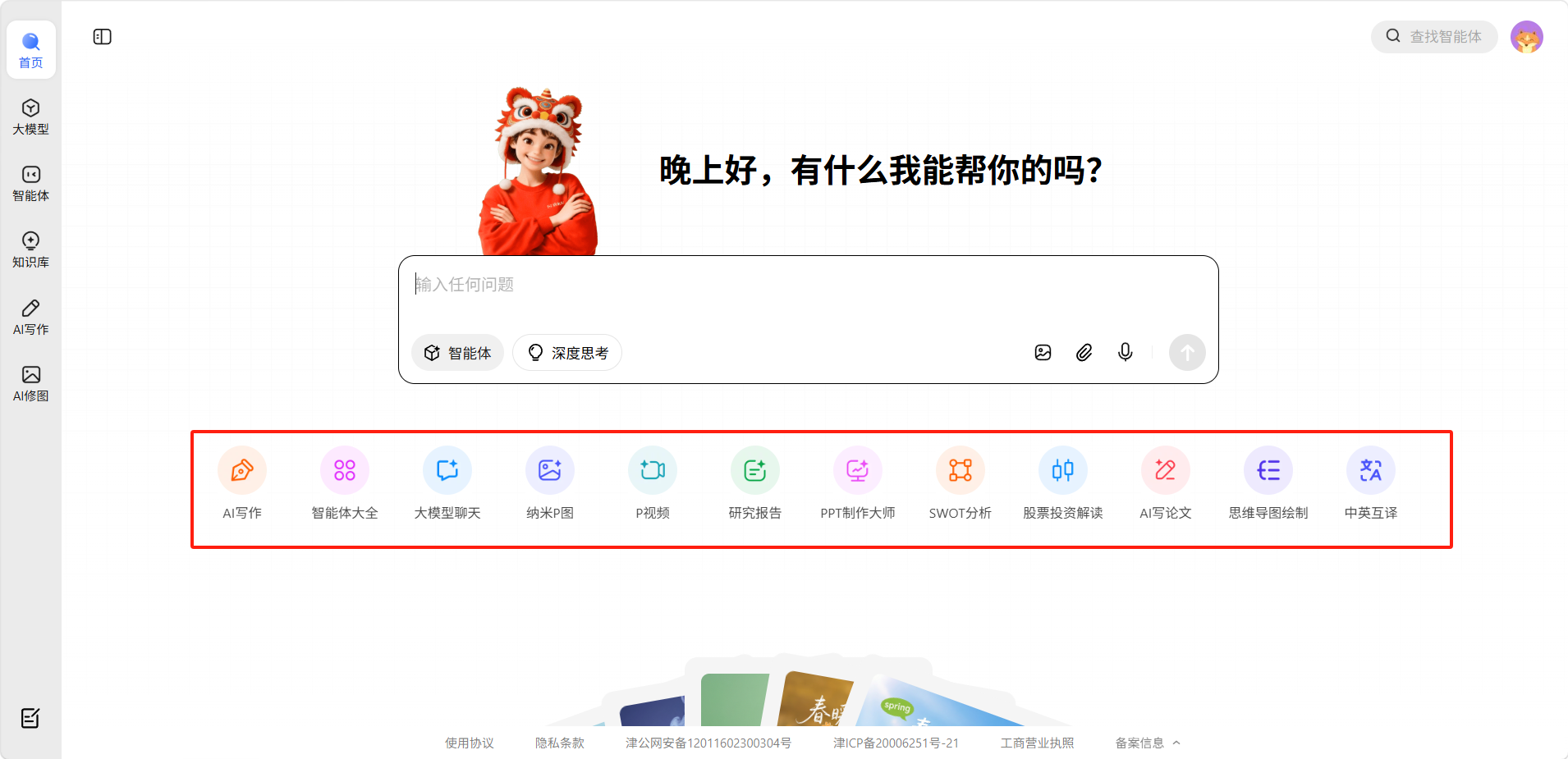 首页输入框下方有一排快捷功能入口,点击「全部」后展开完整列表,功能从左至右依次为:AI写作、智能体大全、大模型聊天、纳米P图、P视频、研究报告、PPT制作大师、SWOT分析、股票投资解读、AI写论文、思维导图绘制、中英互译。