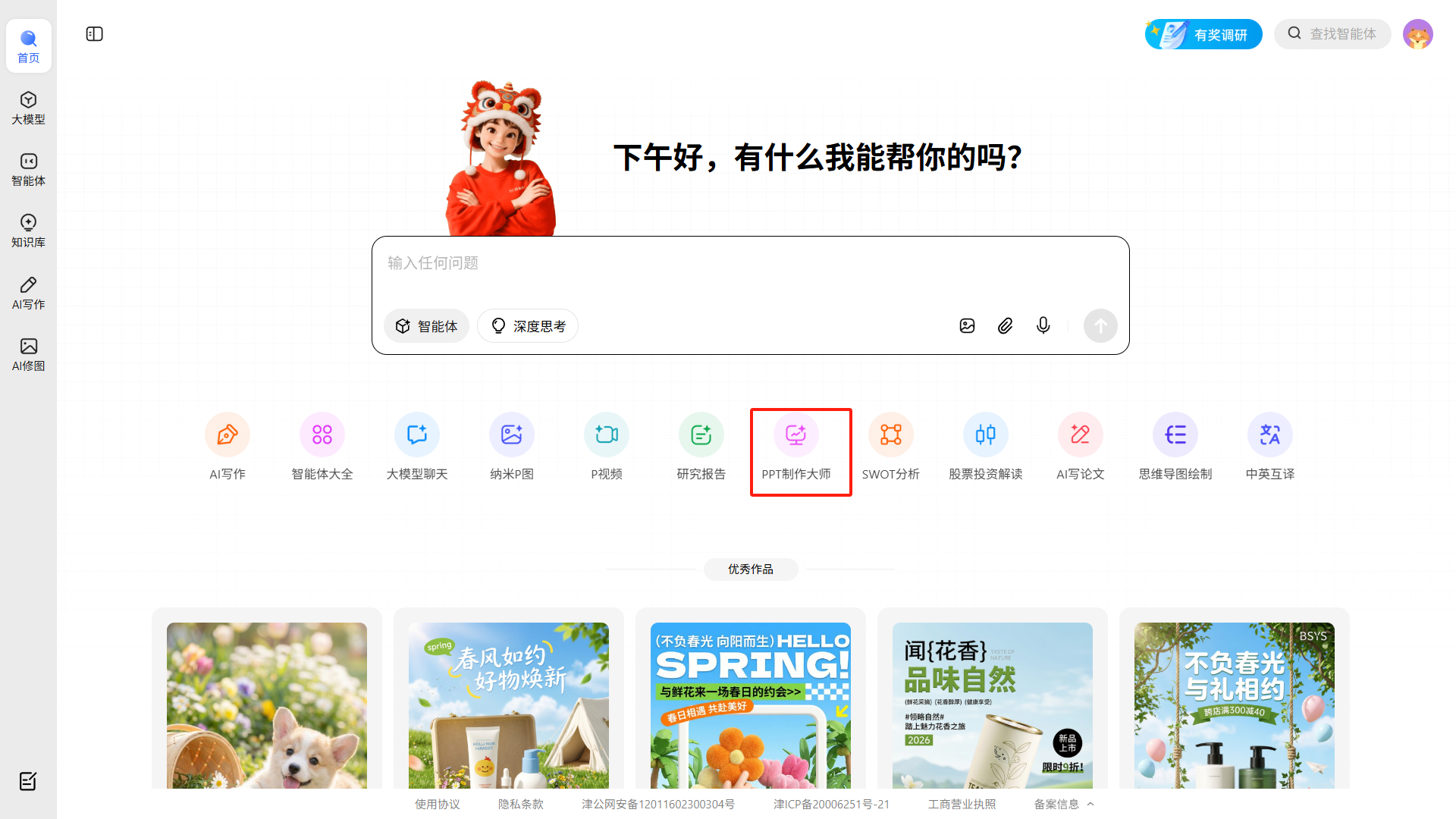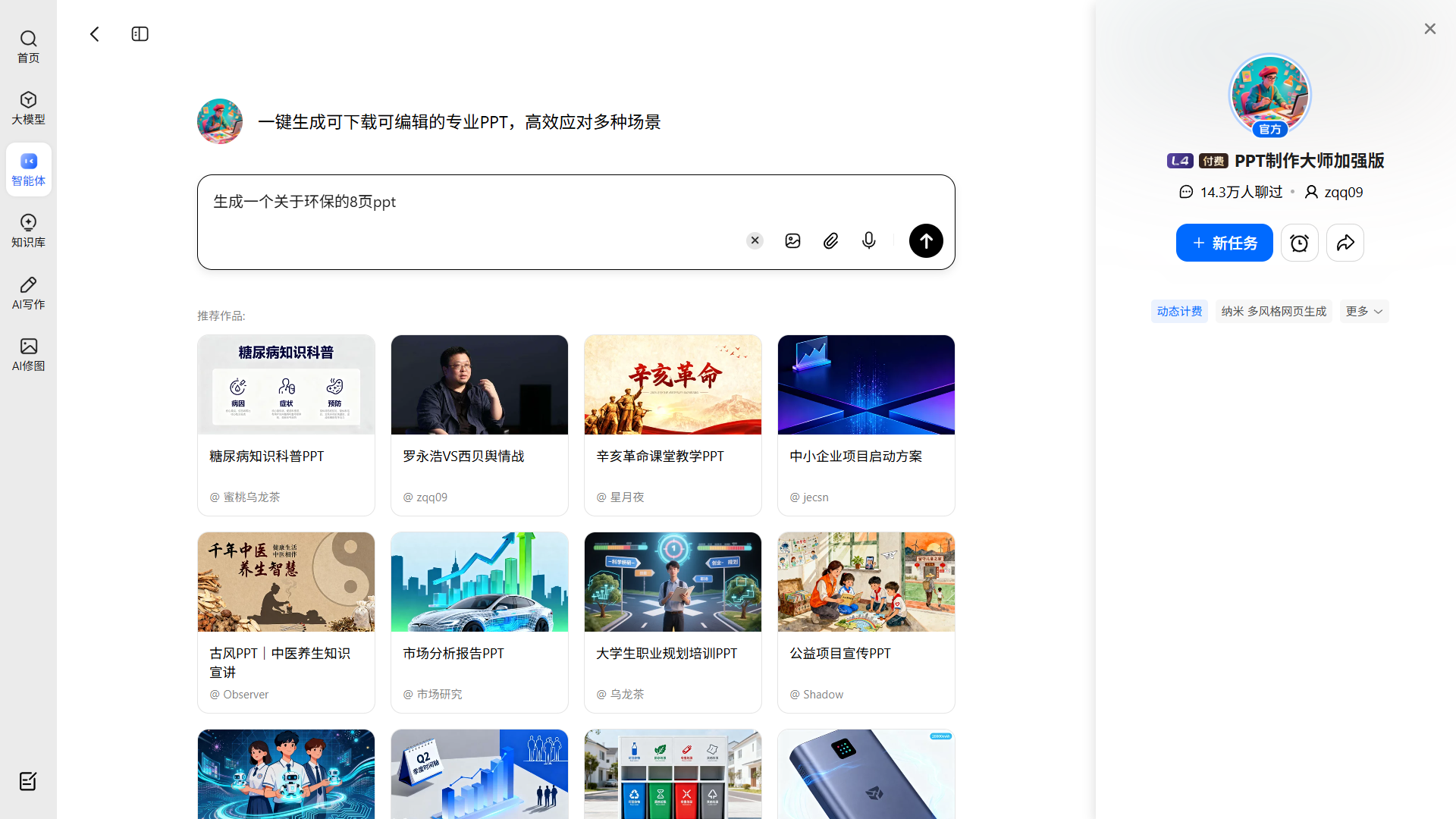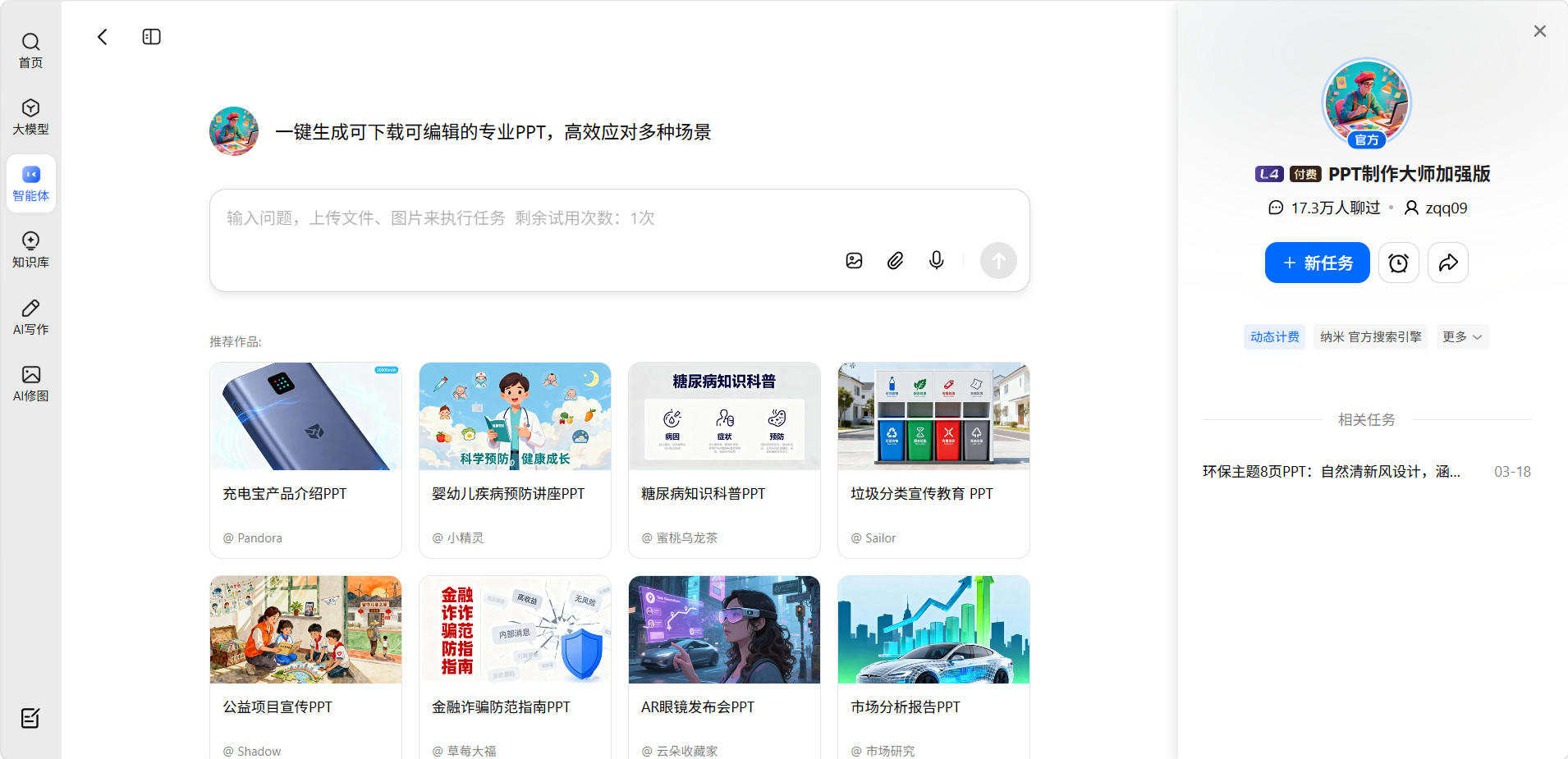 PPT制作大师是纳米AI专为PPT生成场景打造的专属智能体,点击后进入对话式PPT制作流程。只需输入你的PPT主题和基本要求,AI会自动生成包含标题页、目录、各章节内容页和结尾页的完整PPT文字稿,并支持进一步的风格调整和内容修改。