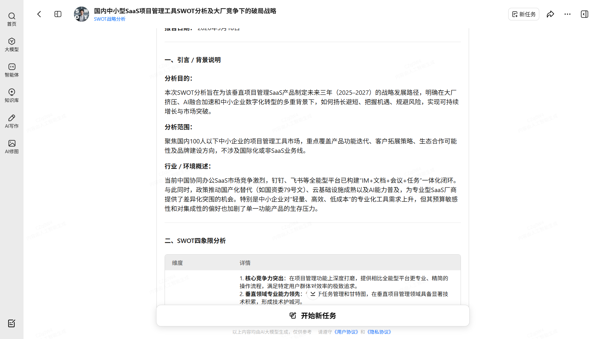 SWOT分析的质量很大程度上取决于你提供的背景信息是否充分。背景越详细、数据越具体,生成的分析就越有参考价值,而不是泛泛而谈的通用结论。