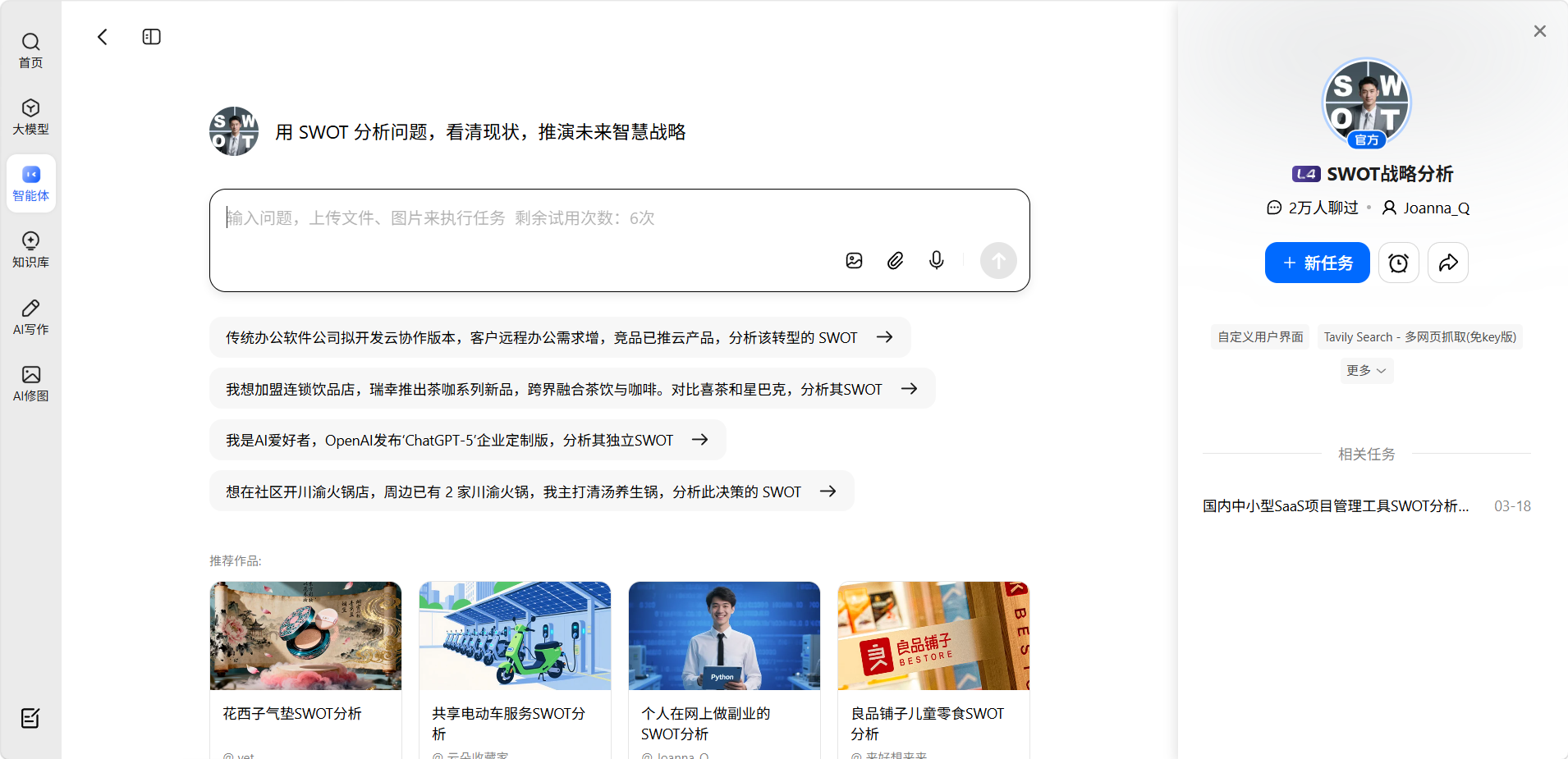 SWOT分析是纳米AI的结构化商业分析工具,点击后进入专项分析流程。SWOT框架(优势Strengths、劣势Weaknesses、机会Opportunities、威胁Threats)是战略管理和商业决策中最常用的分析工具之一,这个功能让你无需手动构建框架,直接输入分析对象和背景信息,AI就会生成一份完整的SWOT分析报告。