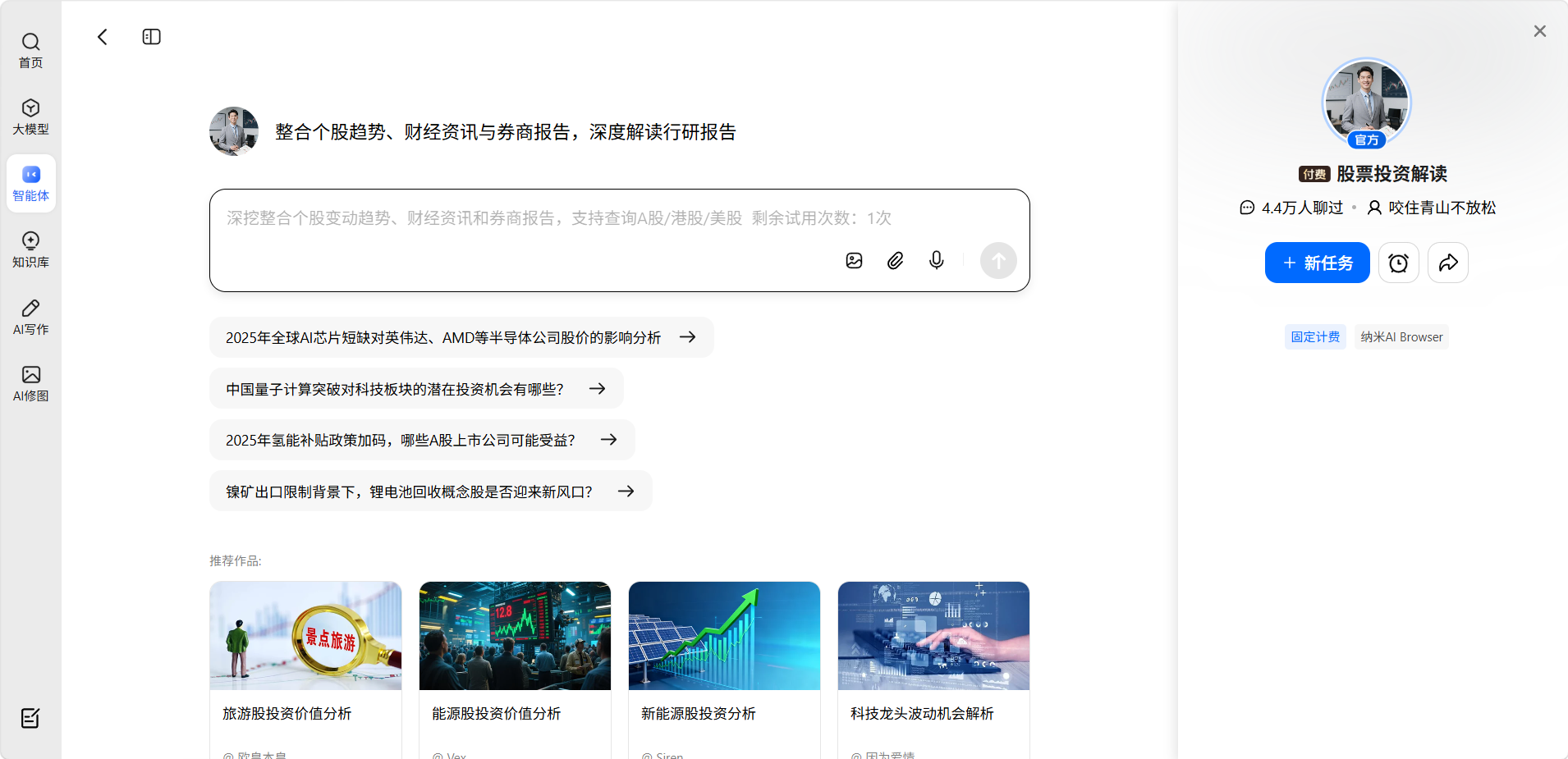 股票投资解读是纳米AI面向投资者的信息分析功能,点击后进入专项投资分析智能体。它能够对上市公司、行业板块、财务数据和市场动态进行综合解读,帮助你更快速地理解复杂的投资信息,辅助形成自己的投资判断。
