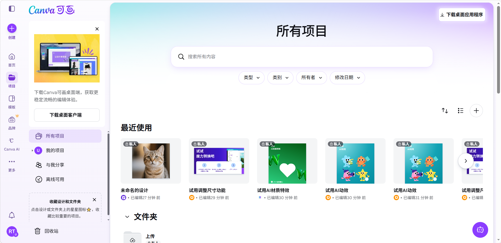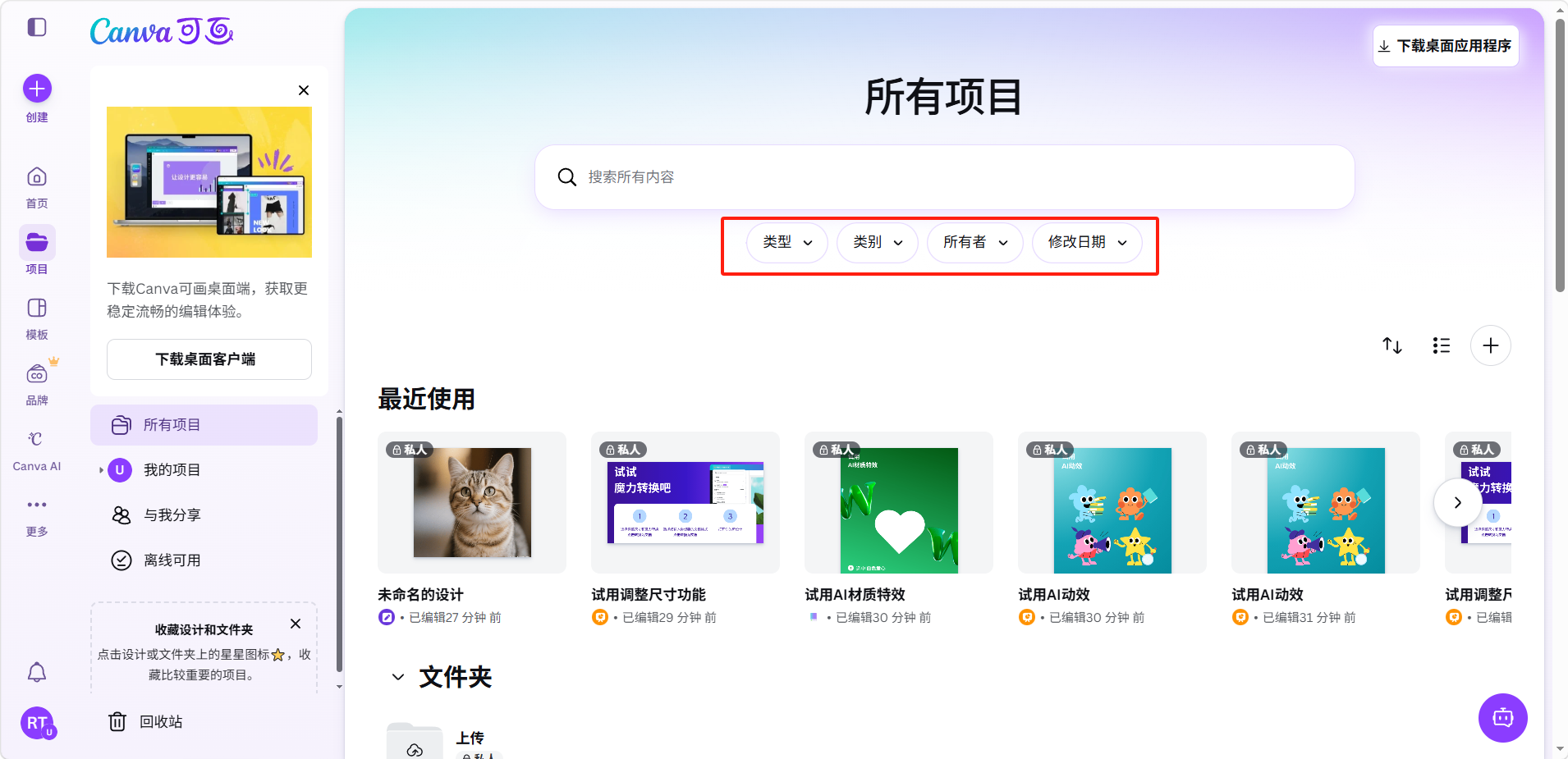 页面顶部提供了强大的筛选工具,你可以按类型(设计、文件夹、图片、视频等)、类别、所有者、修改日期进行筛选,快速定位目标文件。
