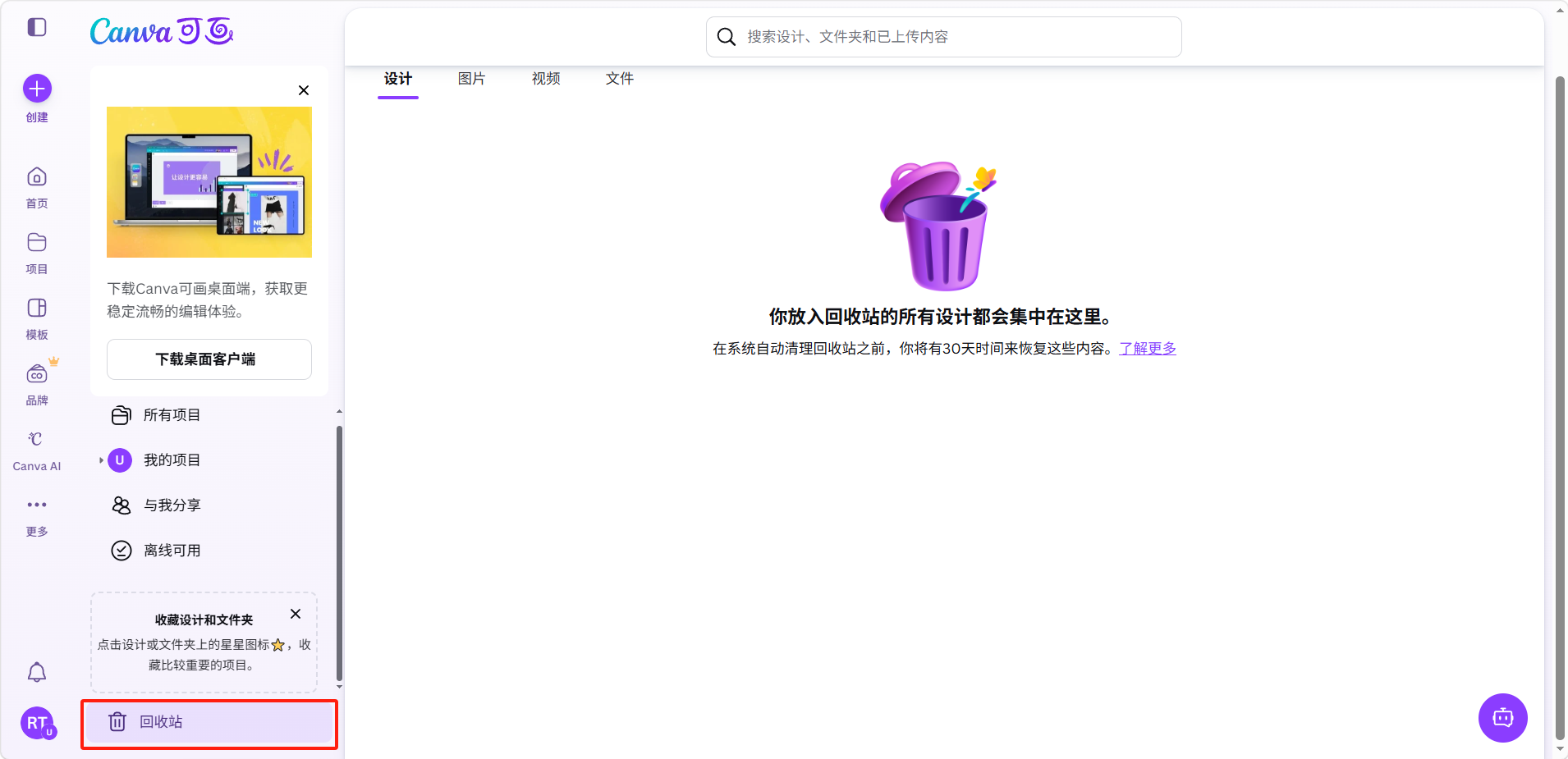 在项目页面底部可以找到「回收站」入口,误删的设计可以从回收站中恢复。