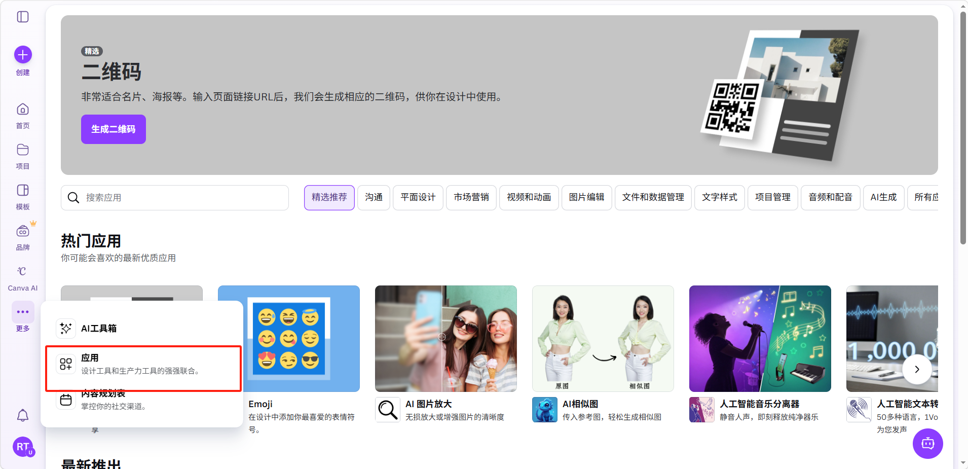 应用市场中的应用按功能分类,涵盖了多个领域:精选推荐、沟通、平面设计、市场营销、视频和动画、图片编辑、文件和数据管理、文字样式、项目管理、音频和配音、AI生成等。每个类别下都有大量优质应用可供选择。市场中的热门应用包括QR code(生成自定义二维码)、Emoji(添加表情符号)、AI图片放大(无损放大图片清晰度)、AI相似图(传入参考图生成相似图)、人工智能音乐分离器、人工智能文本转语音等。