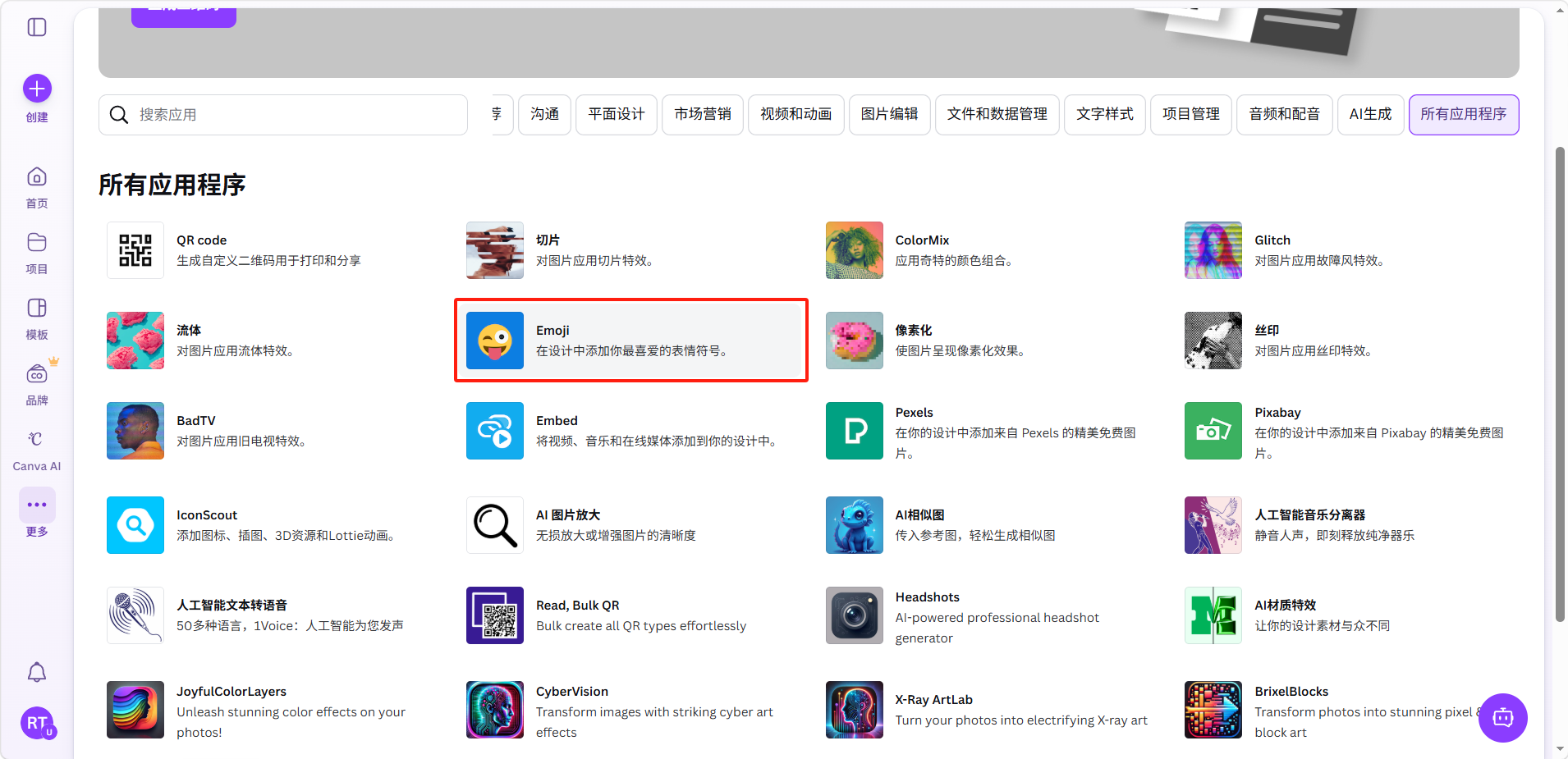 Canva可画的应用市场(Apps)提供了丰富的第三方集成和扩展工具,让你可以在Canva中直接使用各种外部功能,无需切换到其他平台。