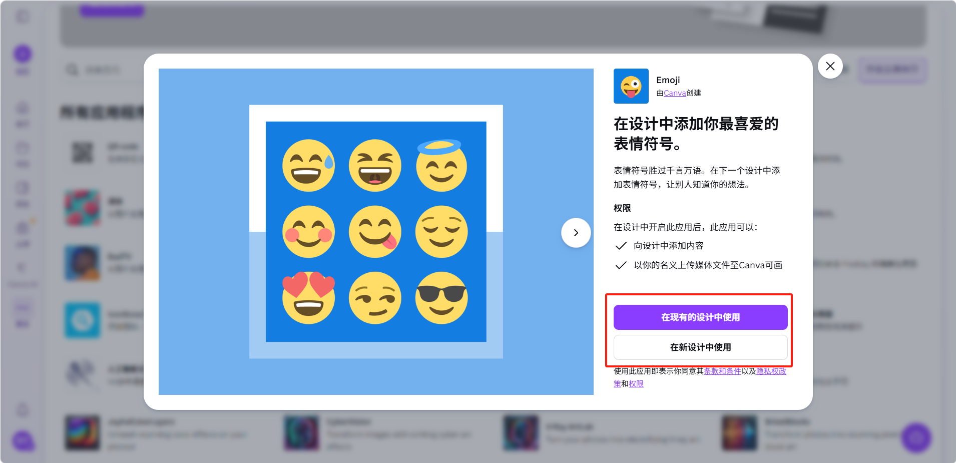 点击「在现有设计中使用」或「在新设计中使用」。