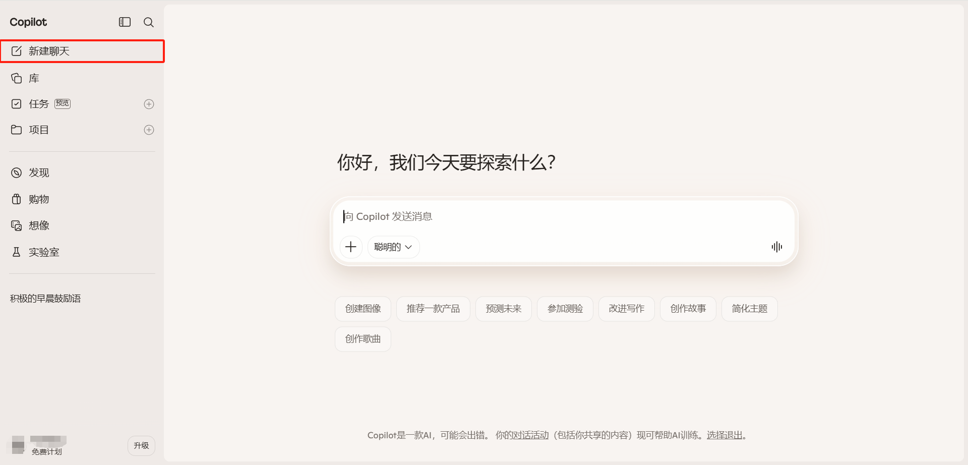 界面下方还提供了快捷操作建议卡片,如「创建图像」「推荐一款产品」「撰写初稿」「参加测验」「改进编码」等,点击即可快速开始对应任务。
