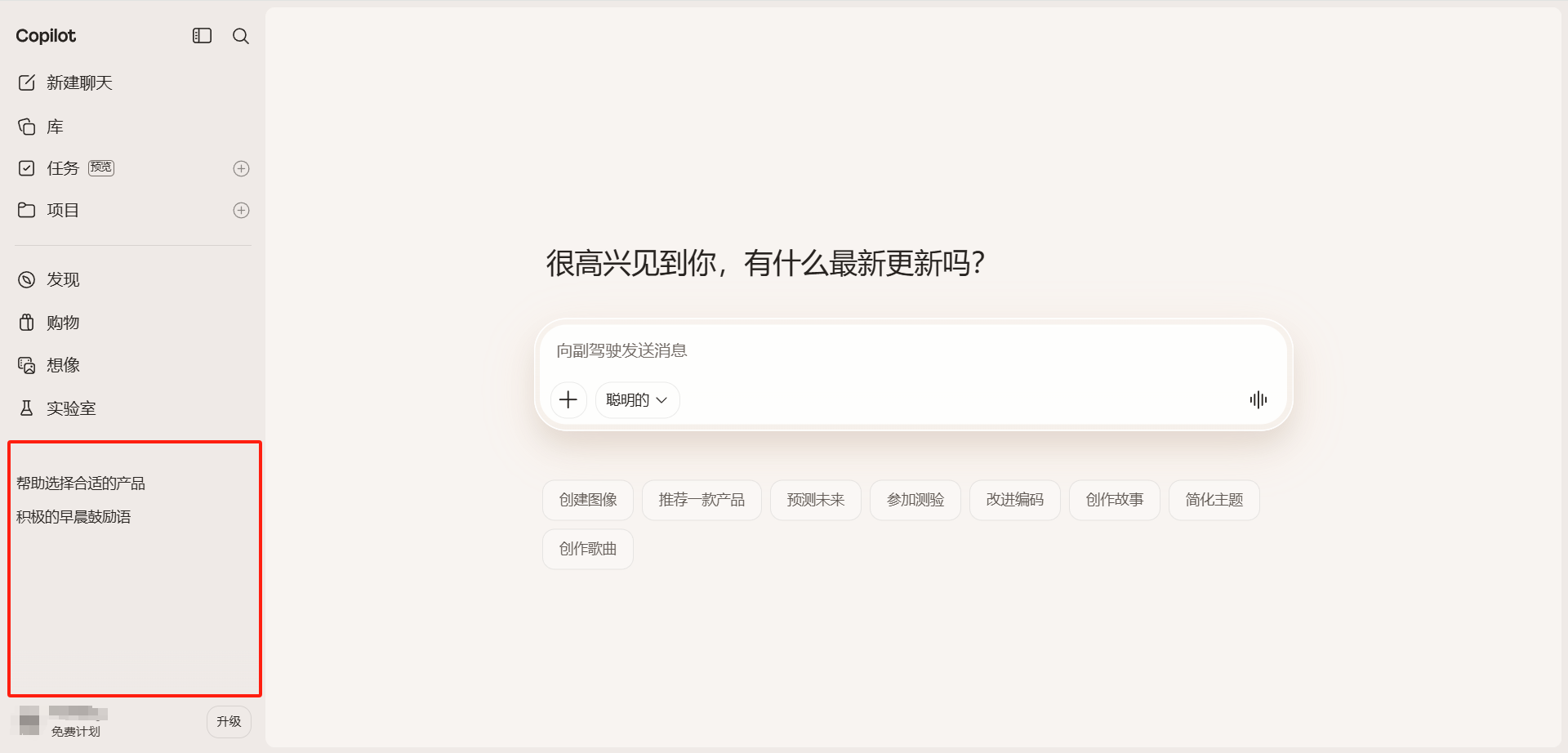 左侧边栏会显示用户与 Copilot 的历史对话列表。需要注意的是,旧版 Copilot 的先前对话可能需要几分钟时间才能显示出来。
