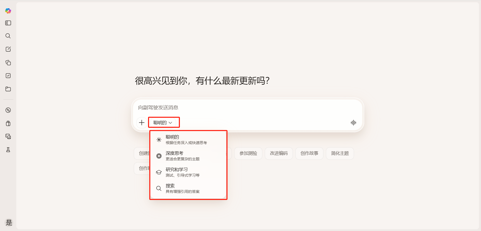Copilot 提供了多种对话模式,可以在输入框下方的模式选择器中切换: