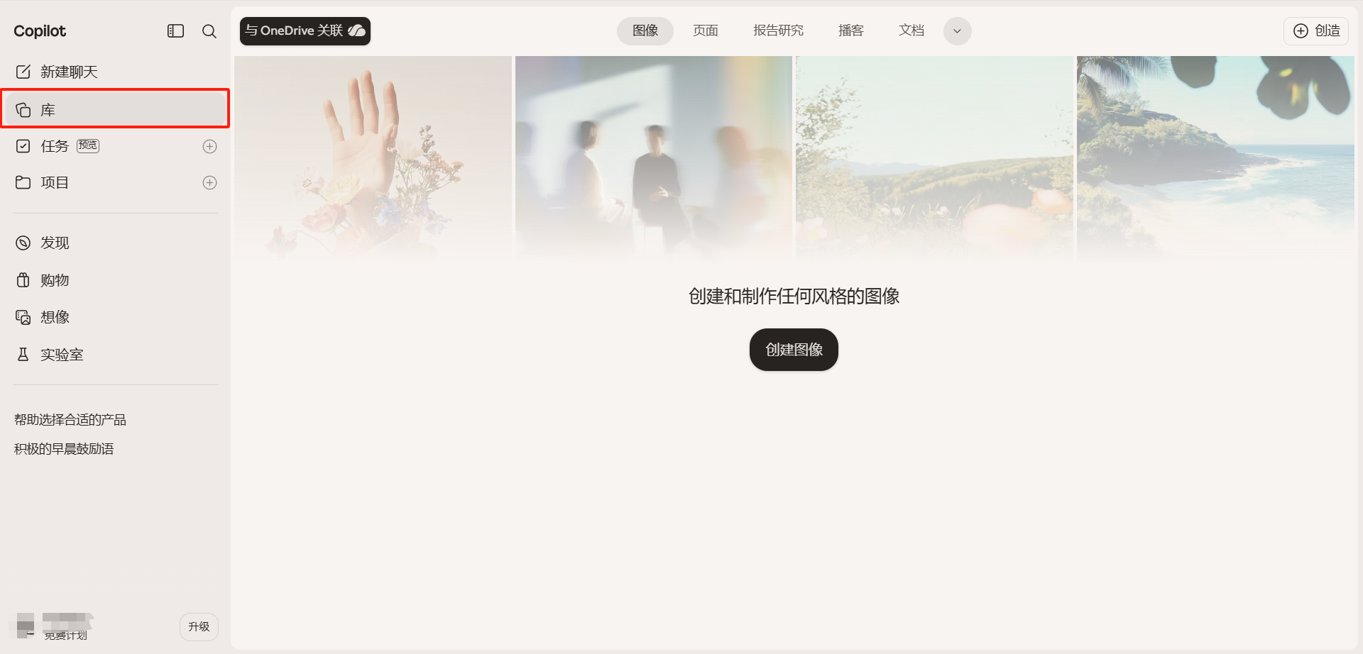 点击左侧边栏的「库」按钮进入库页面。库是 Copilot 的创意资产管理中心,可以集中查看和管理用户在 Copilot 中创建的各类内容。