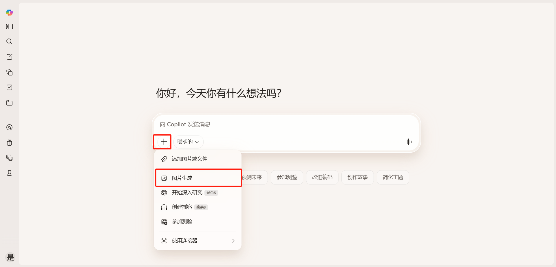 生成图片有两种入口:一是在对话中直接输入图片描述,或点击快捷卡片「创建图像」;二是通过输入框的「+」按钮选择「图片生成」功能。