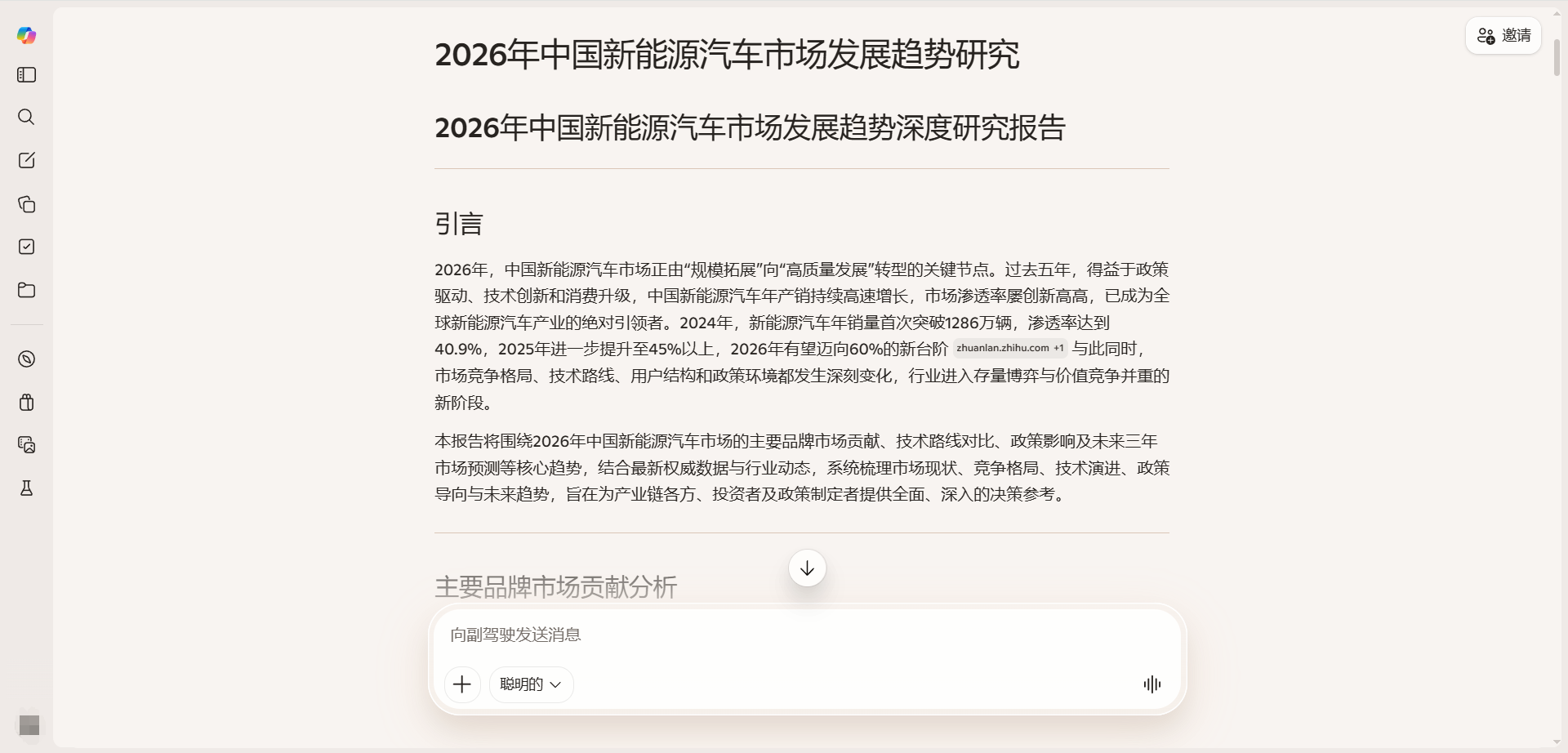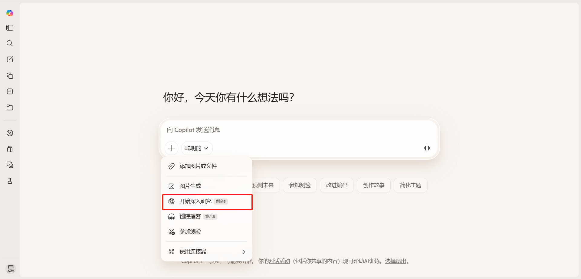 深入研究(Deep Research)是 Copilot 的高级调研功能,可以针对复杂话题进行多维度的深入调研和分析。与普通对话不同,深入研究会花更多时间搜索和整理互联网信息,最终生成一份结构化的研究报告,包含来源引用、数据图表和分析结论。