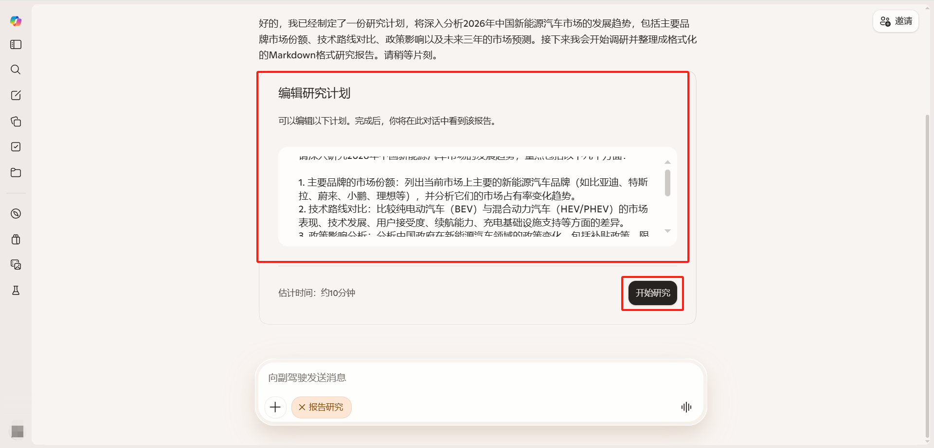输入需求后Copilot 会给出一份研究计划,用户可以进行修改。修改完成后点击「开始研究」即可生成报告。