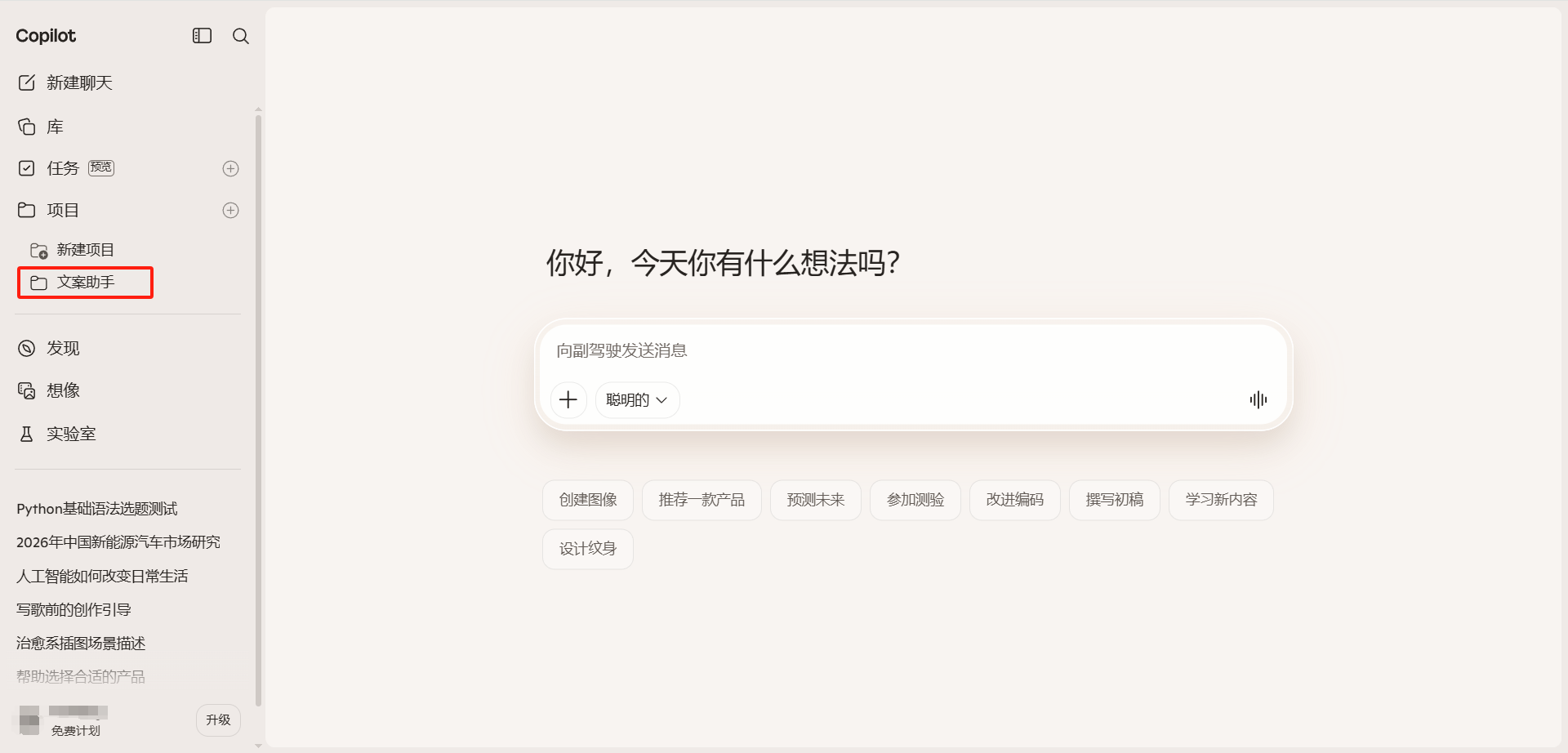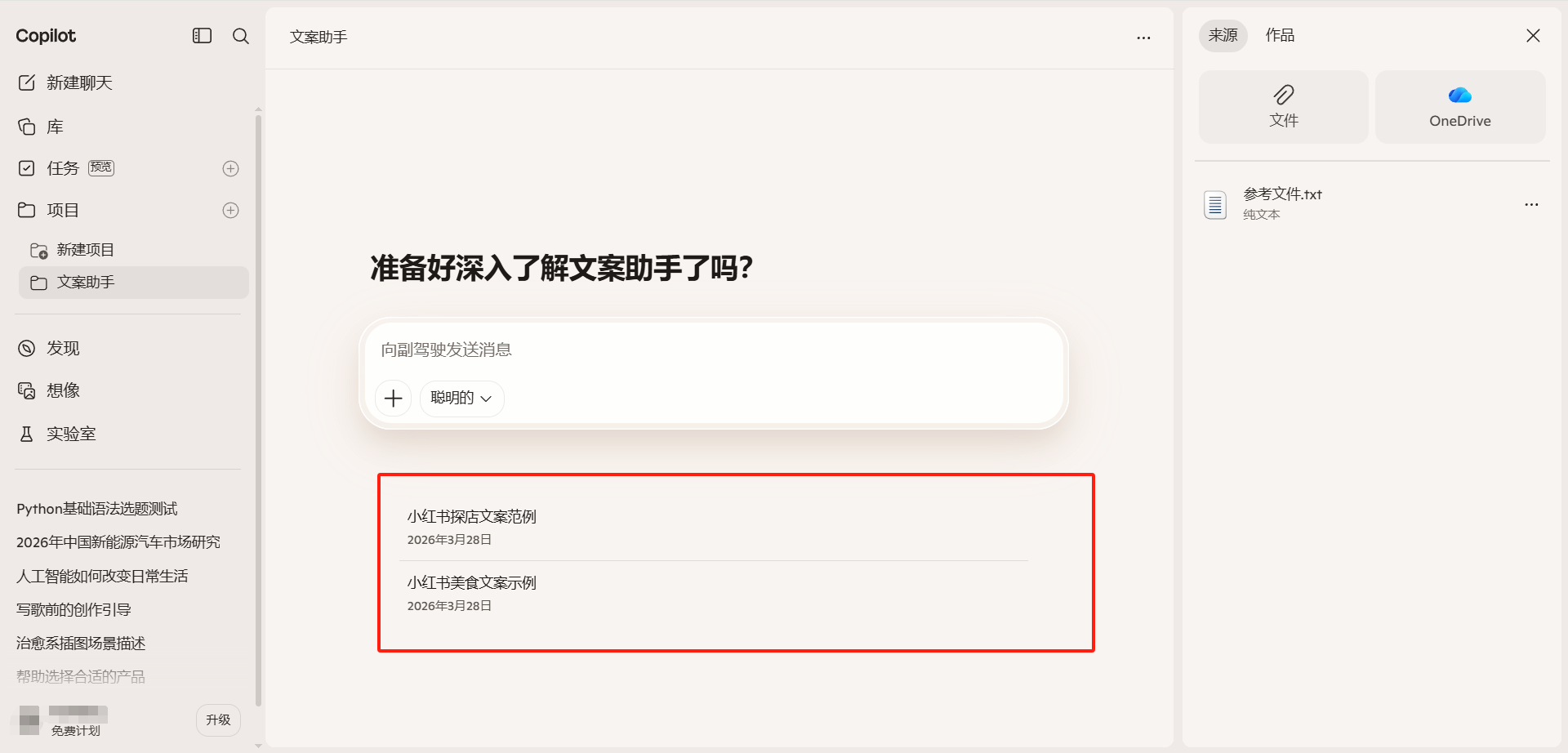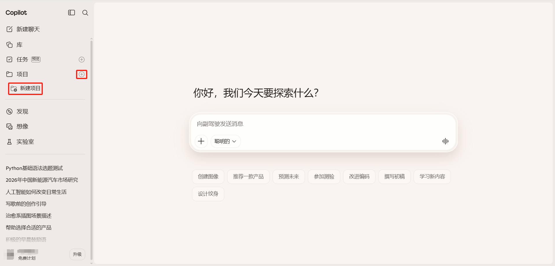 Copilot 项目功能允许用户将对话和文件集中放置在一个专属工作空间中。创建项目后,用户可以为项目命名、上传相关文件,然后在项目内开展多轮对话。项目内的所有对话都可以访问项目中上传的文件,无需每次重新上传。