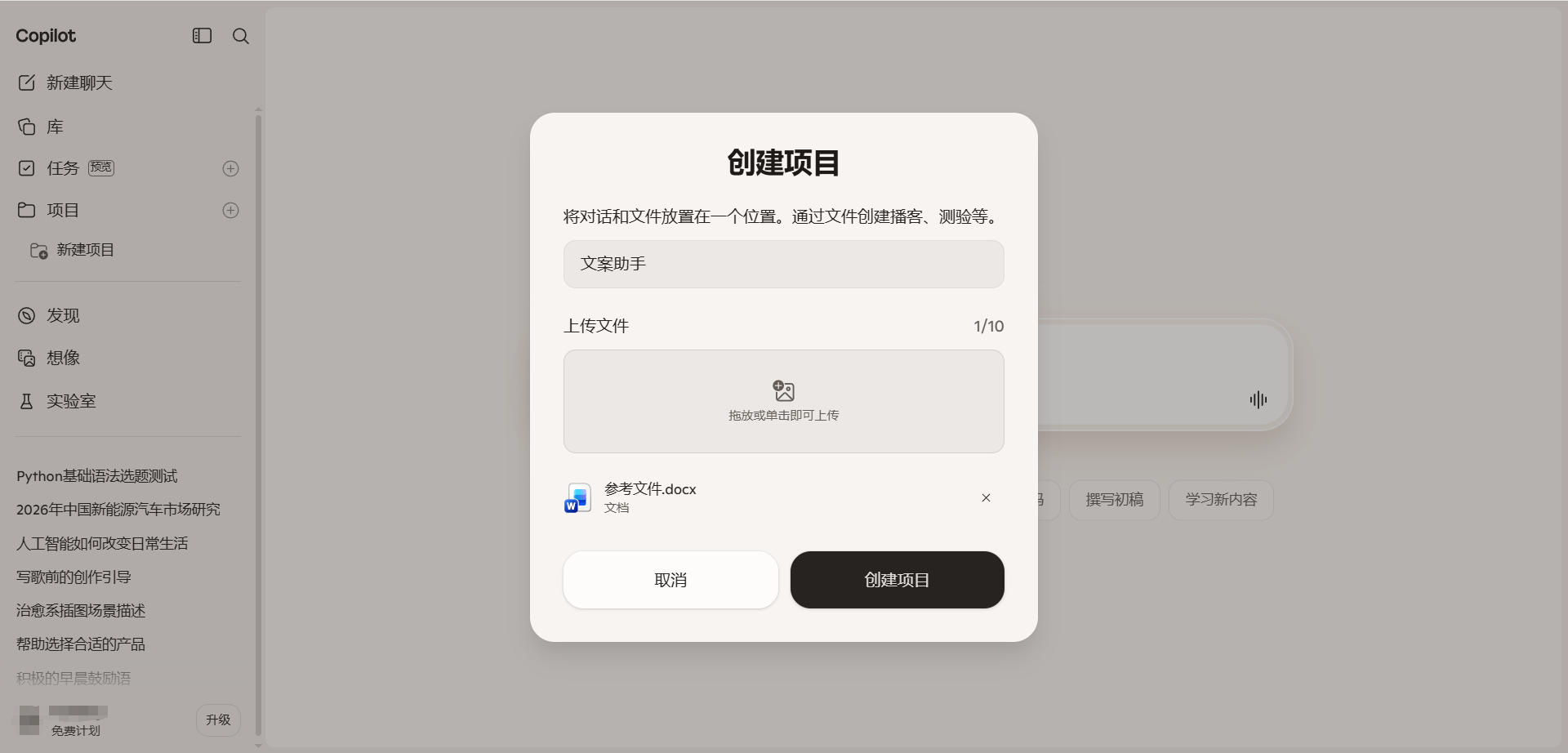 在弹出的对话框中输入项目名称,上传参考文件(最多上传10个文件)。然后点击「创建项目」完成创建。