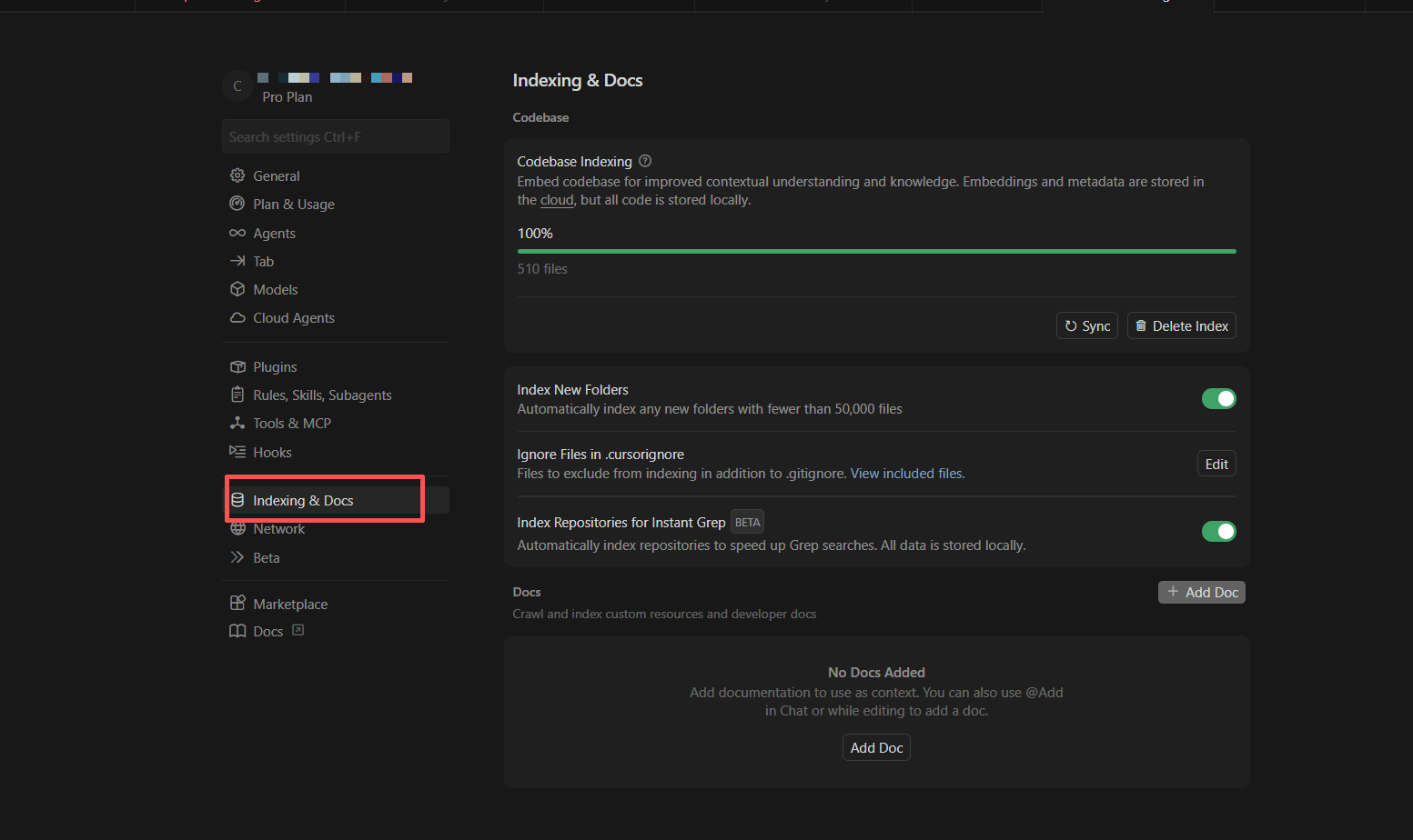 当你打开一个项目时,Cursor 会自动进行代码库索引: