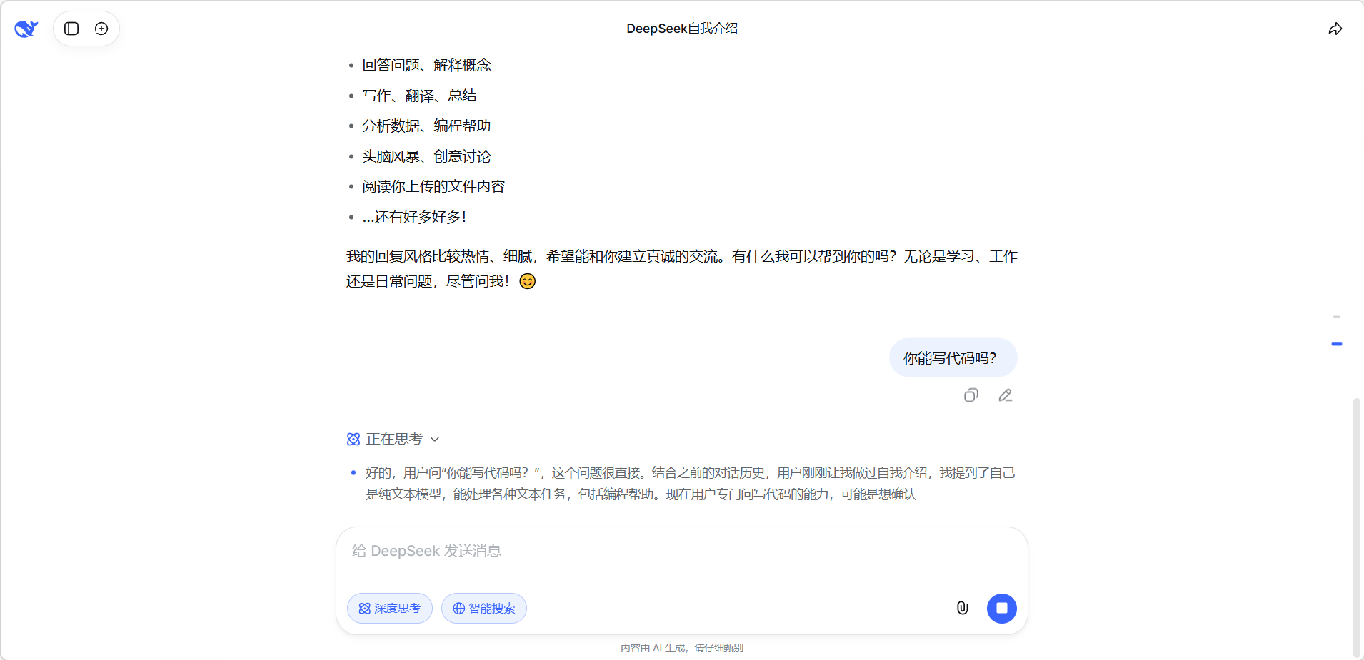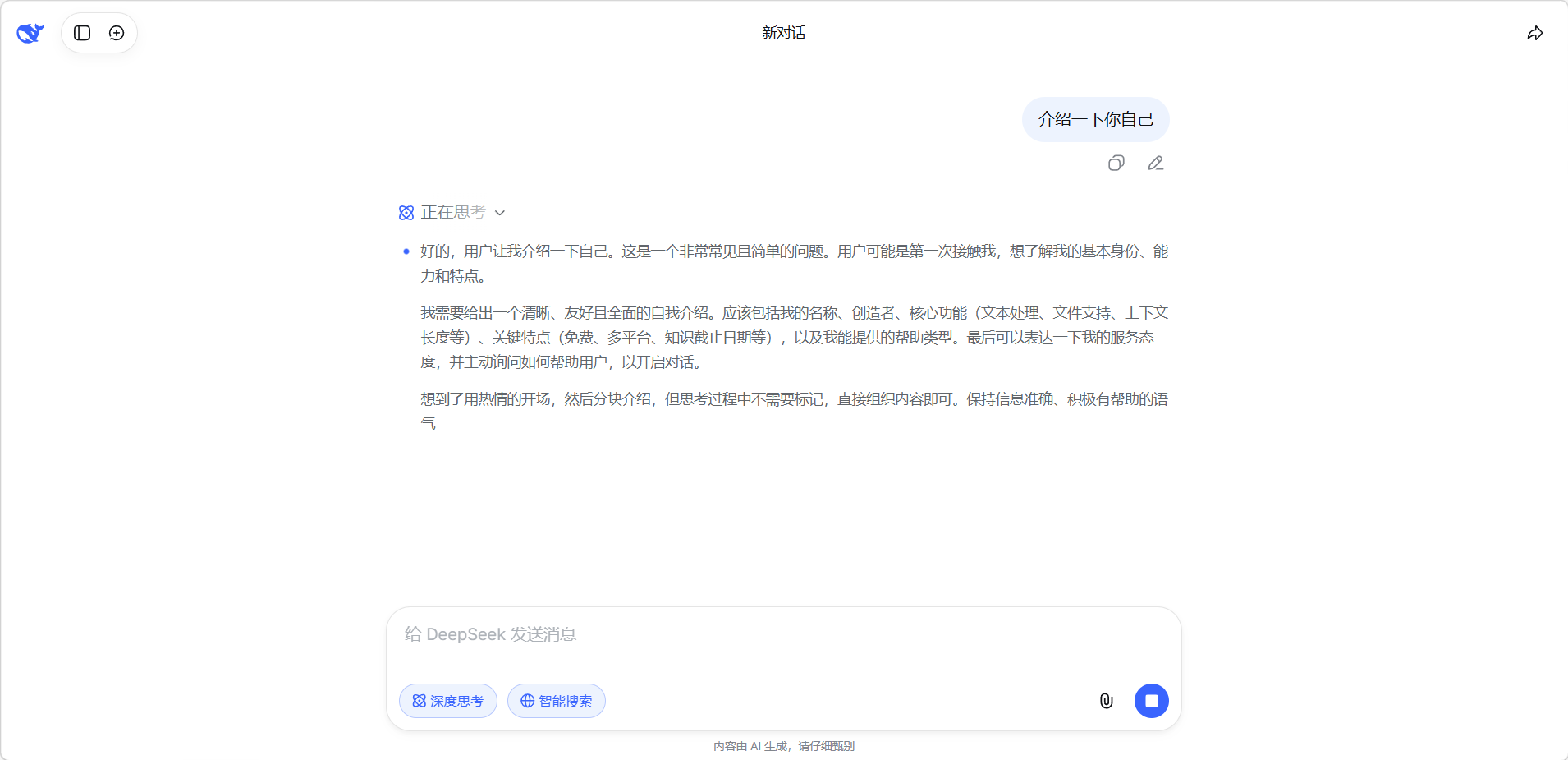 发送后等待 DeepSeek 回复。若开启了「深度思考」,会先看到灰色的思考过程逐步展开,随后给出回复。