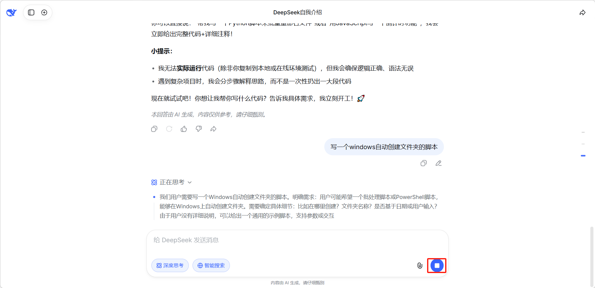 如果 DeepSeek 正在输出内容,但你想中途停止,点击输入框右侧出现的「停止生成」按钮(方形图标)即可立即停止。已生成的内容会保留,你可以继续在此基础上追问。