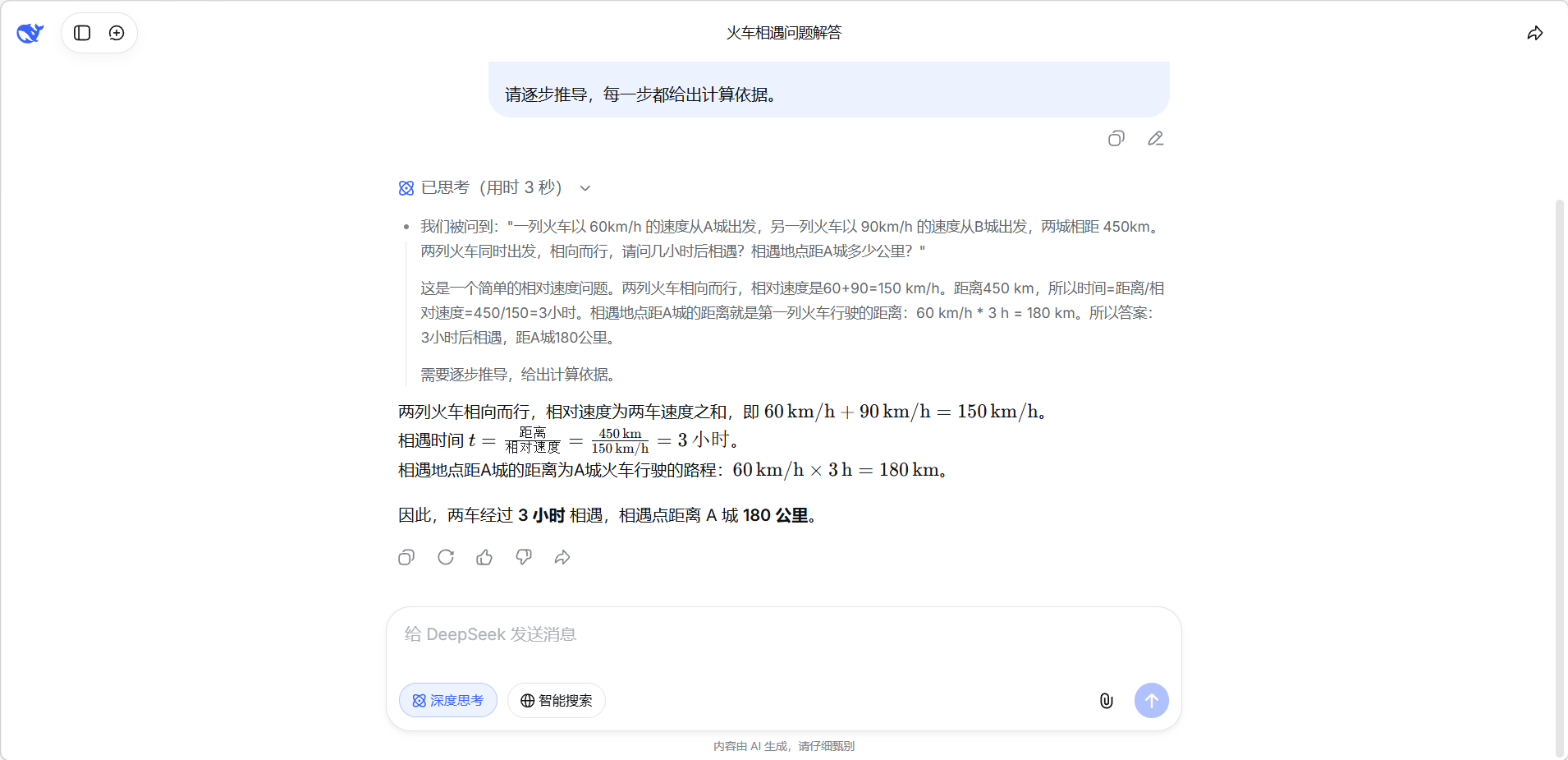 深度思考是 DeepSeek 最具代表性的核心功能之一。点击输入框下方的「深度思考」按钮后,DeepSeek 会切换到 DeepSeek-R1 推理模型,在给出最终答案之前,先在界面上展示一段灰色的「思考过程」——就像一个学生在解题时先打草稿、逐步推演,最后给出经过严格论证的答案。