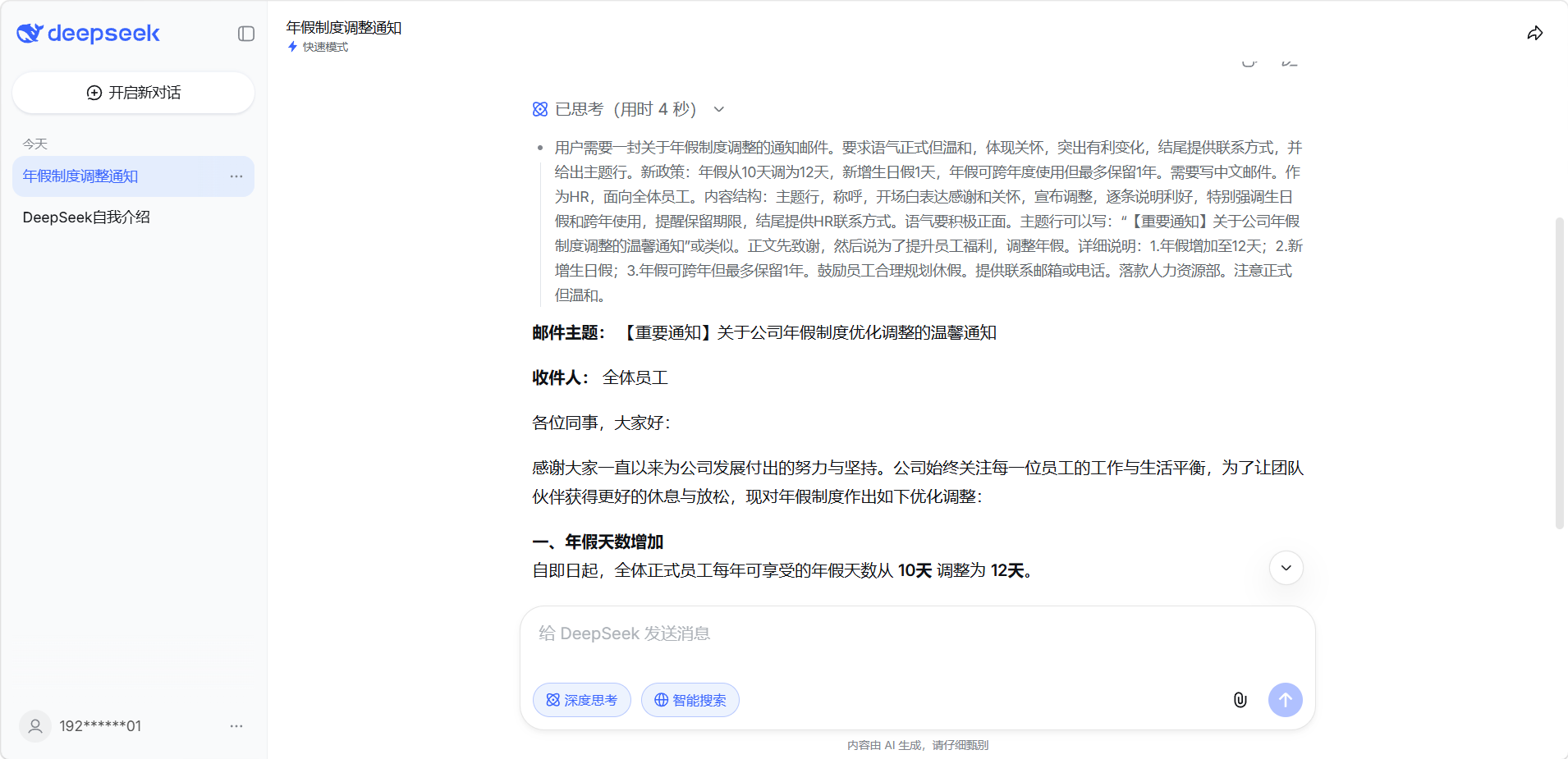 DeepSeek 具备强大的内容生成能力,可以根据需求创作各类文字内容,包括文章、报告、邮件、社交媒体文案、演讲稿、诗歌、故事等。V3 模型在内容生成方面表现比较出色,能够准确把握不同语境下的语气和风格差异。
