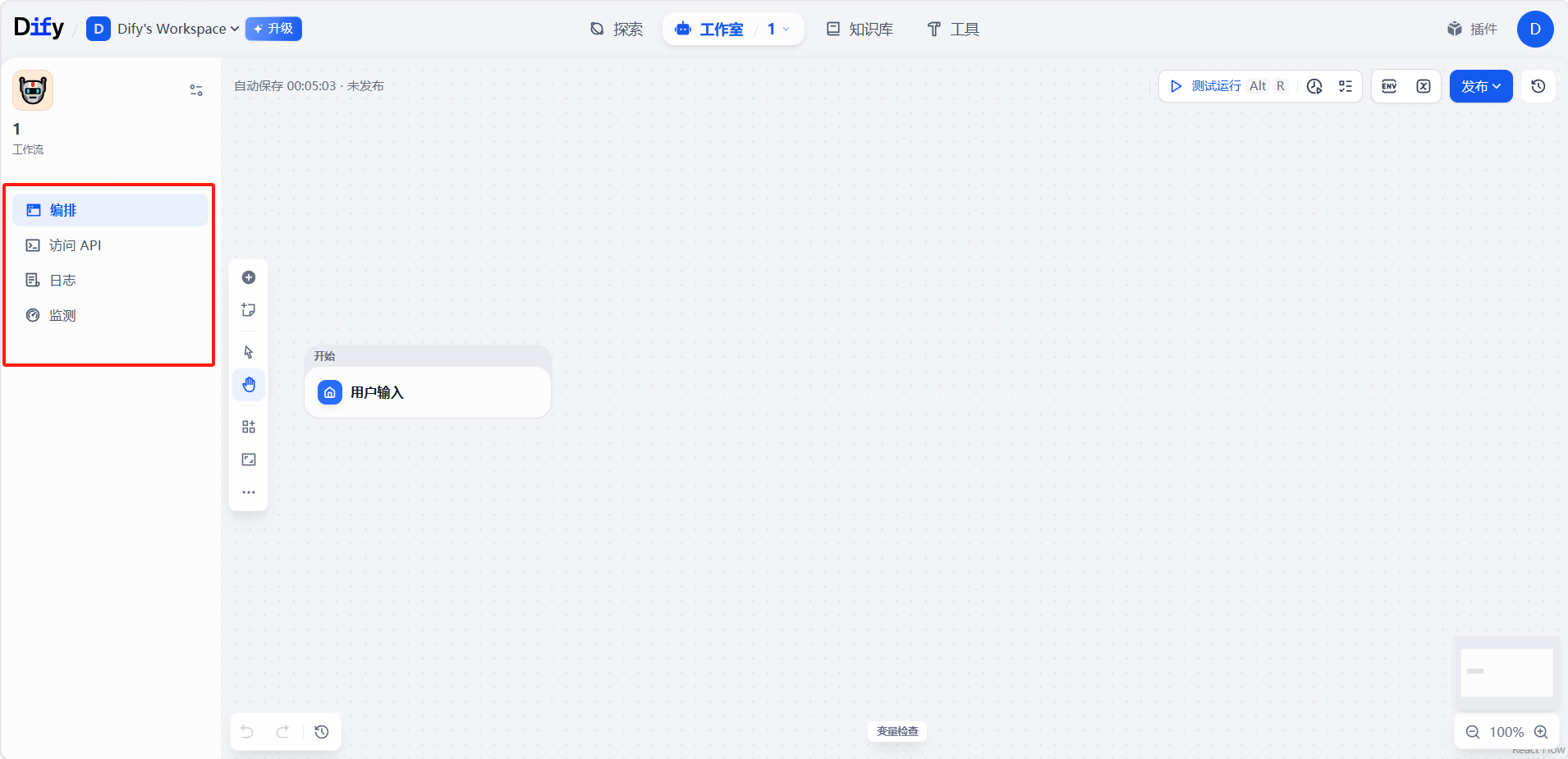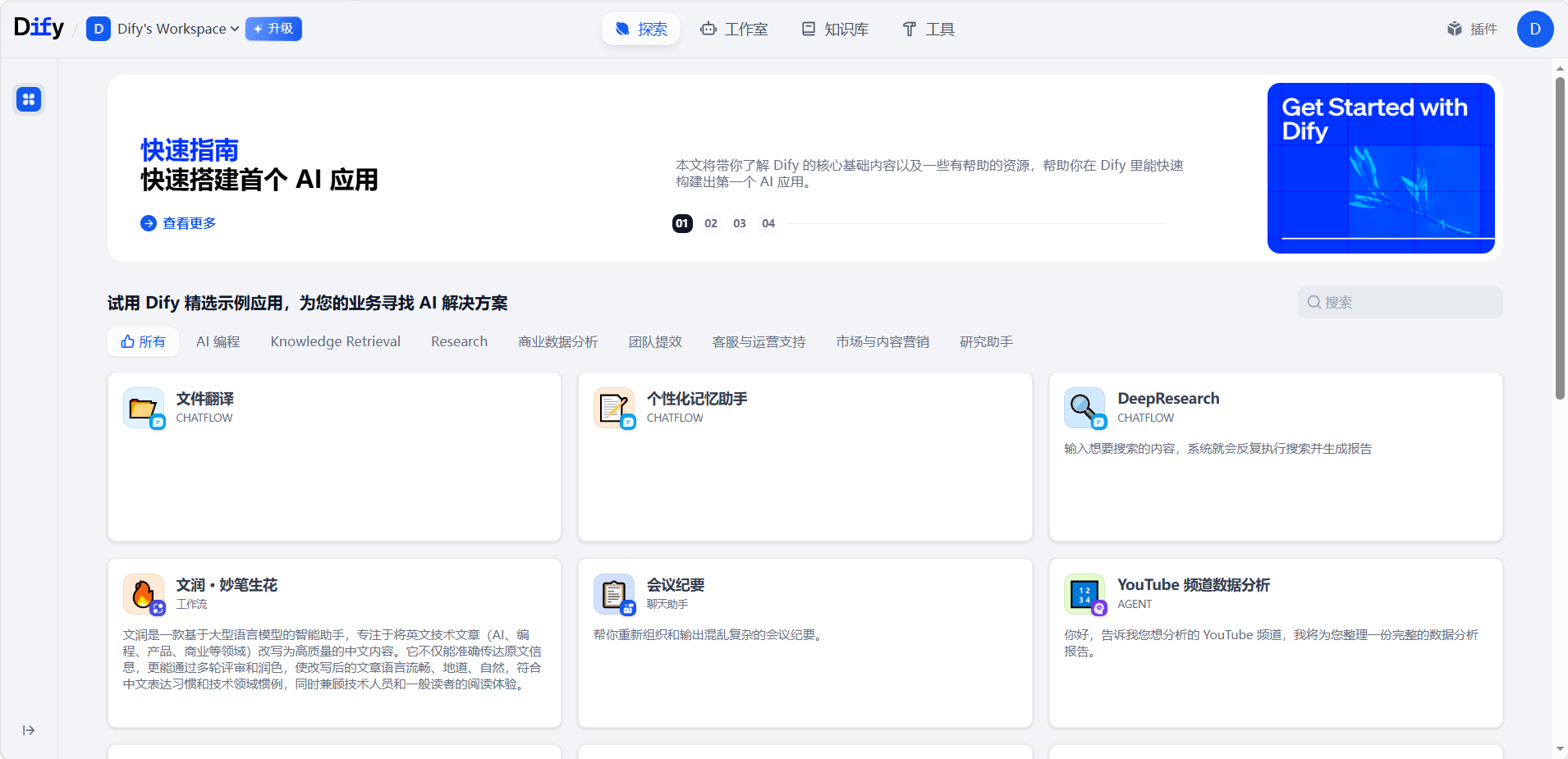 Dify 的界面由顶部导航栏和左侧功能面板组成,主要包含以下核心区域: