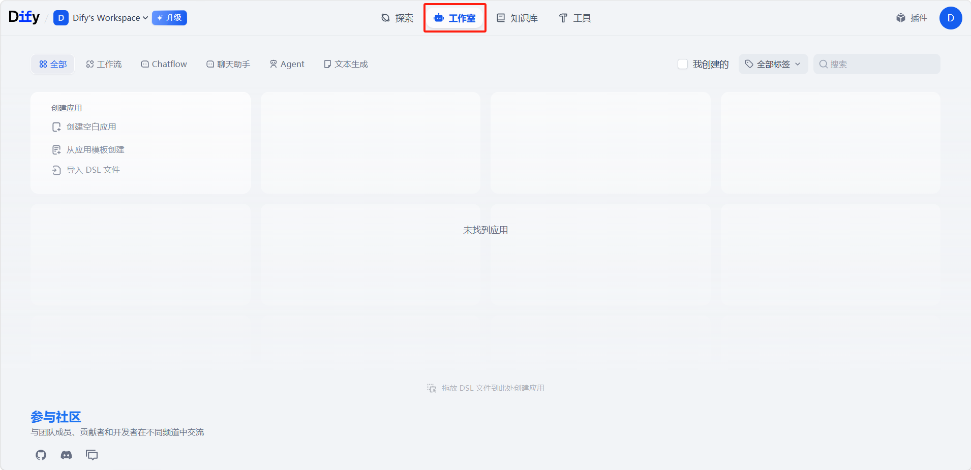进入「工作室」后,你会看到应用列表页面,顶部有应用类型筛选标签: