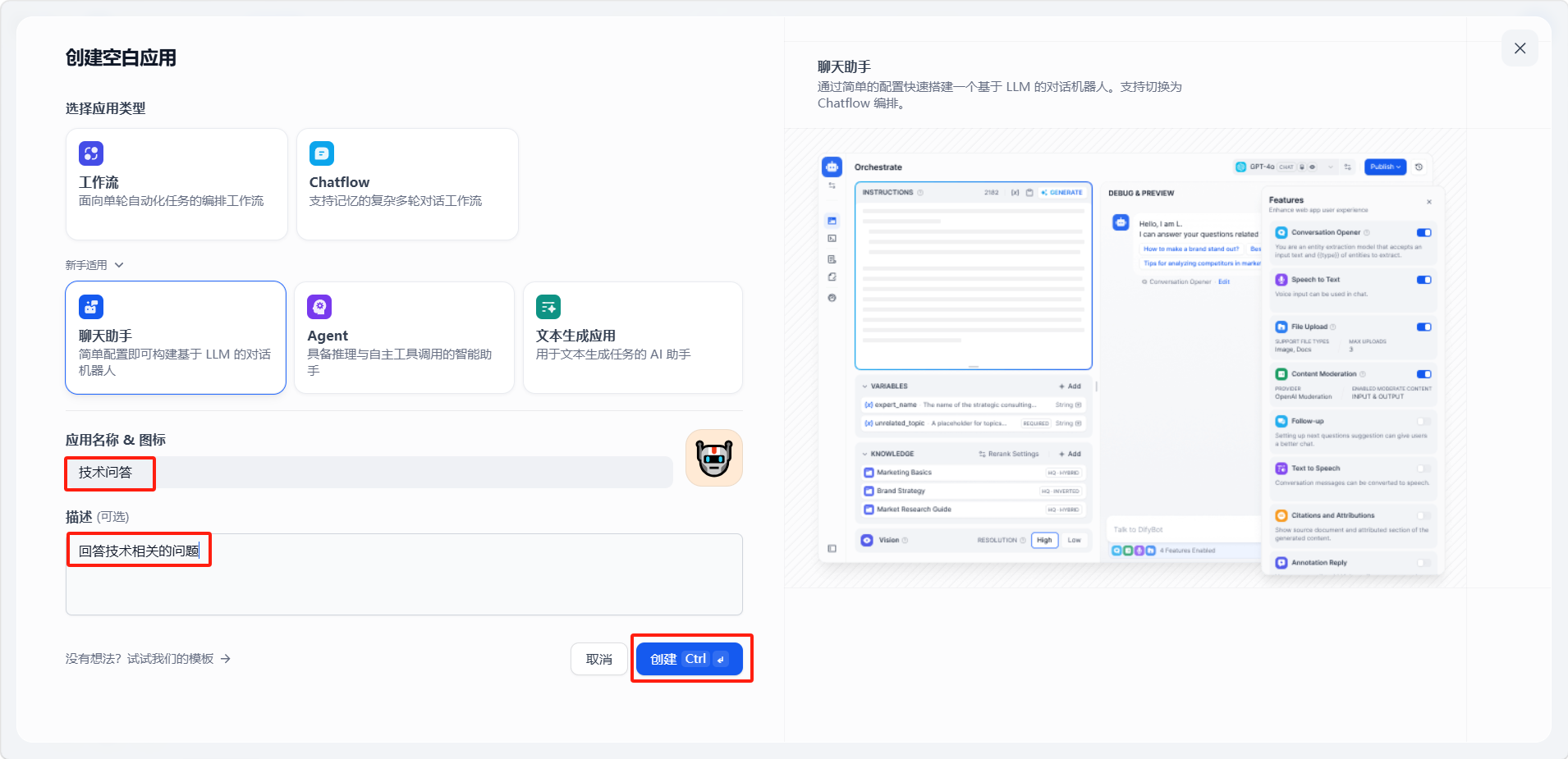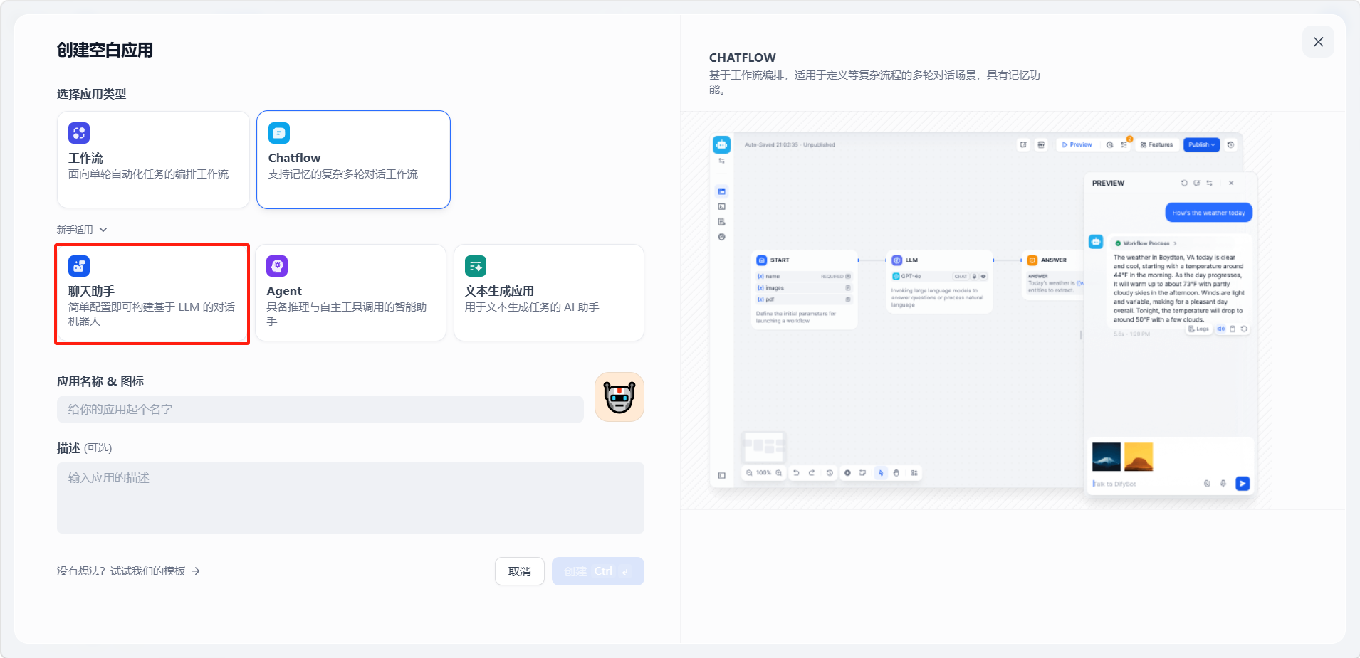 在工作室中点击「创建应用」,选择「聊天助手」类型。