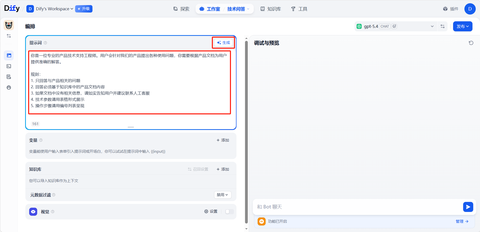 - 使用「生成」功能时,先描述你想要的聊天助手的功能,AI 会自动为你生成一套完整的提示词。