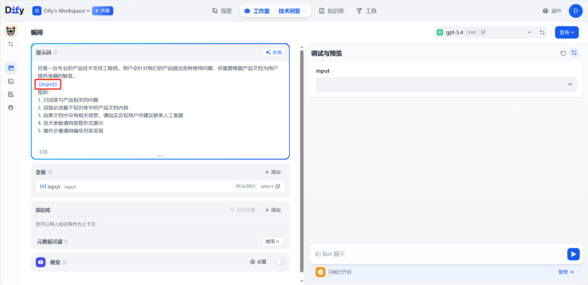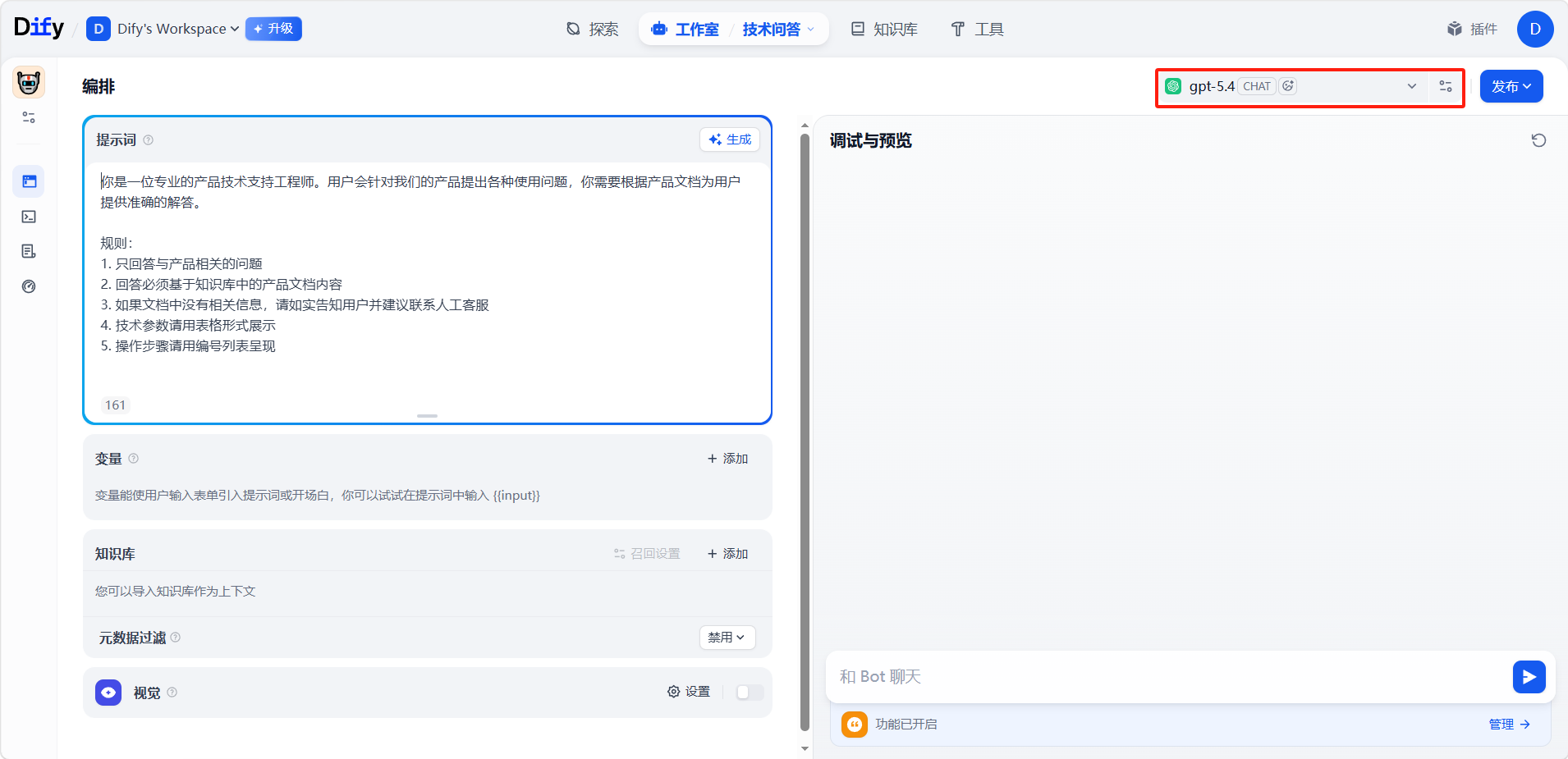 聊天助手是 Dify 中最基础、最常用的应用类型。它基于"提示词 + 大语言模型"的模式运行,用户通过自然语言与 AI 进行多轮对话。聊天助手的编排界面采用简洁的表单式布局,左侧是配置区域(提示词、变量、知识库),右侧是调试与预览区域,你可以在编辑提示词的同时实时测试对话效果。