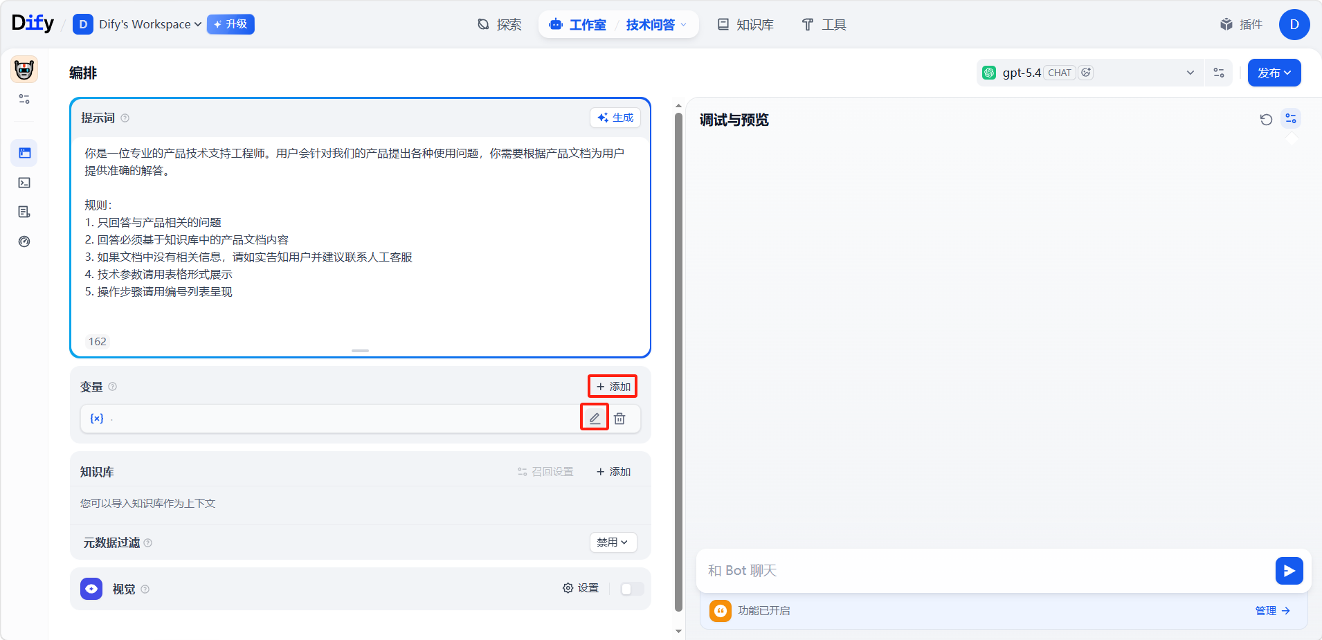 language变量来控制回复语言。 - 知识库关联后,建议在提示词中增加引用知识库的指令,如"请优先根据知识库中的内容回答"。
