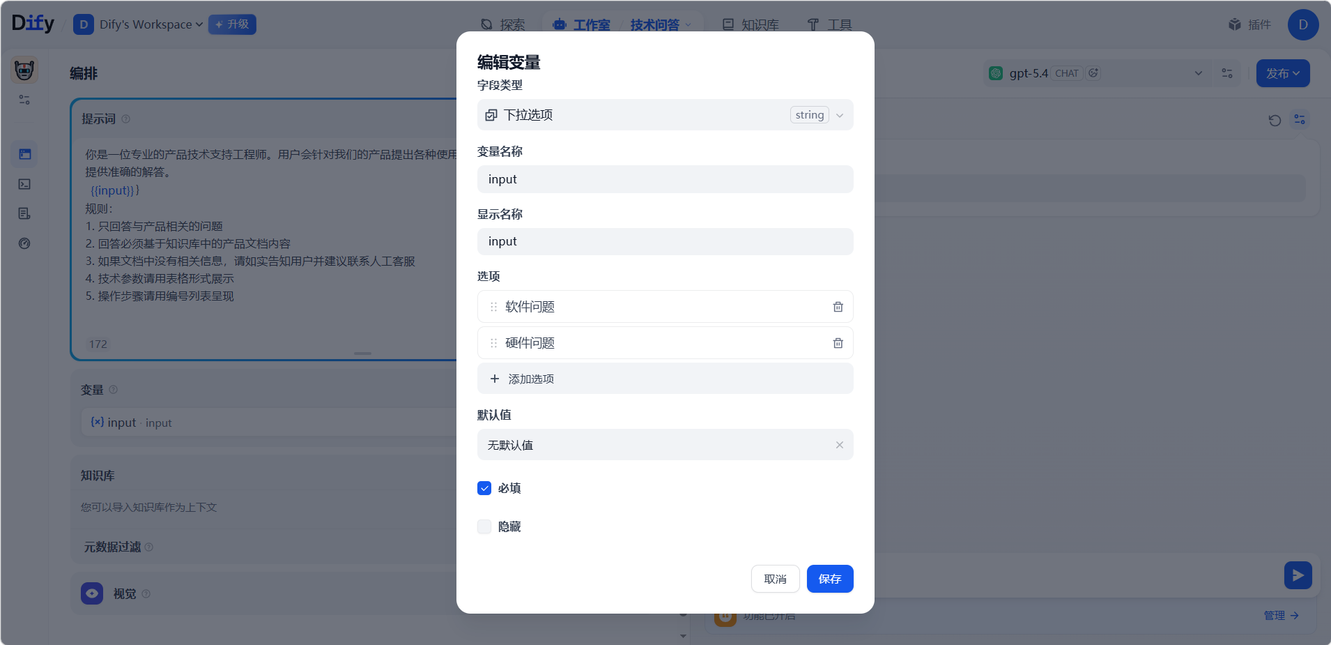 在「变量」区域点击「+ 添加」,定义用户输入表单引入提示词或开场白(可选)。