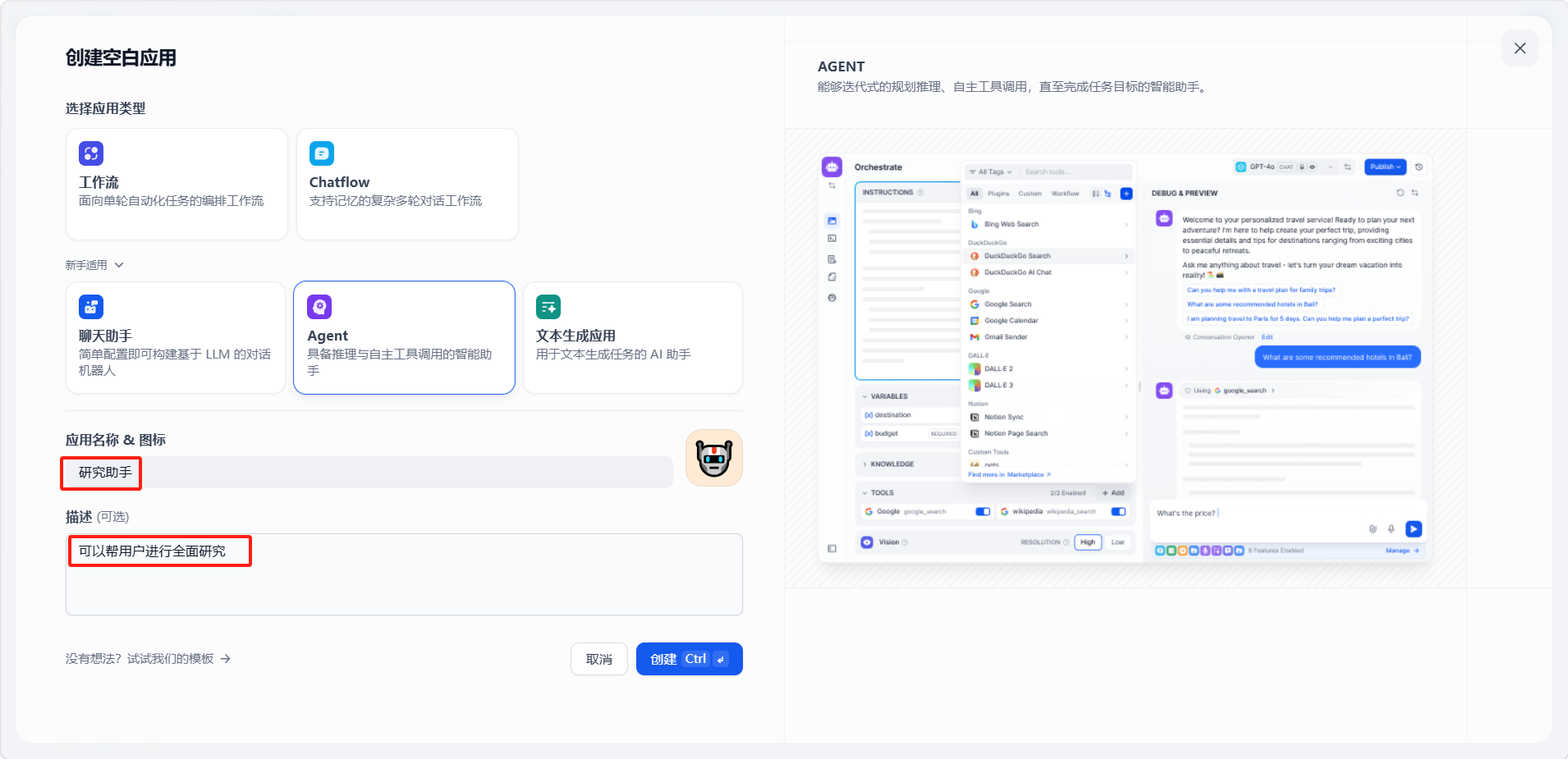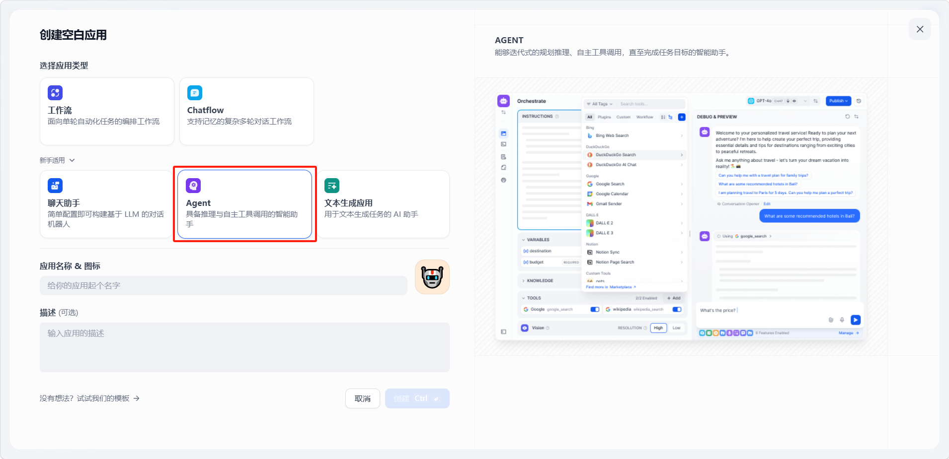 在工作室中点击「创建应用」,选择「Agent」类型。