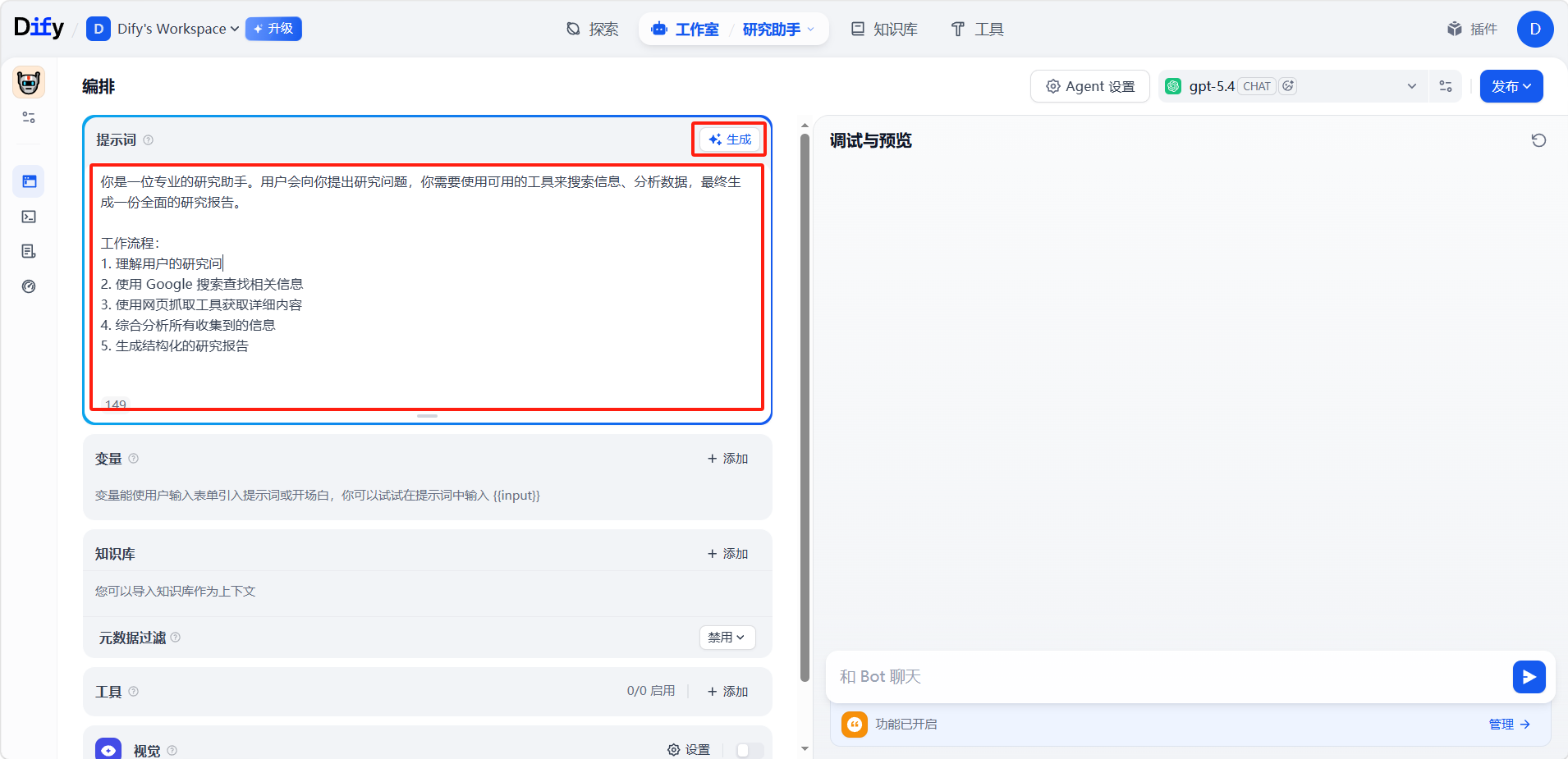编写提示词,定义 Agent 的角色和行为规则,或点击右上角的「生成」按钮,让 AI 自动生成提示词。