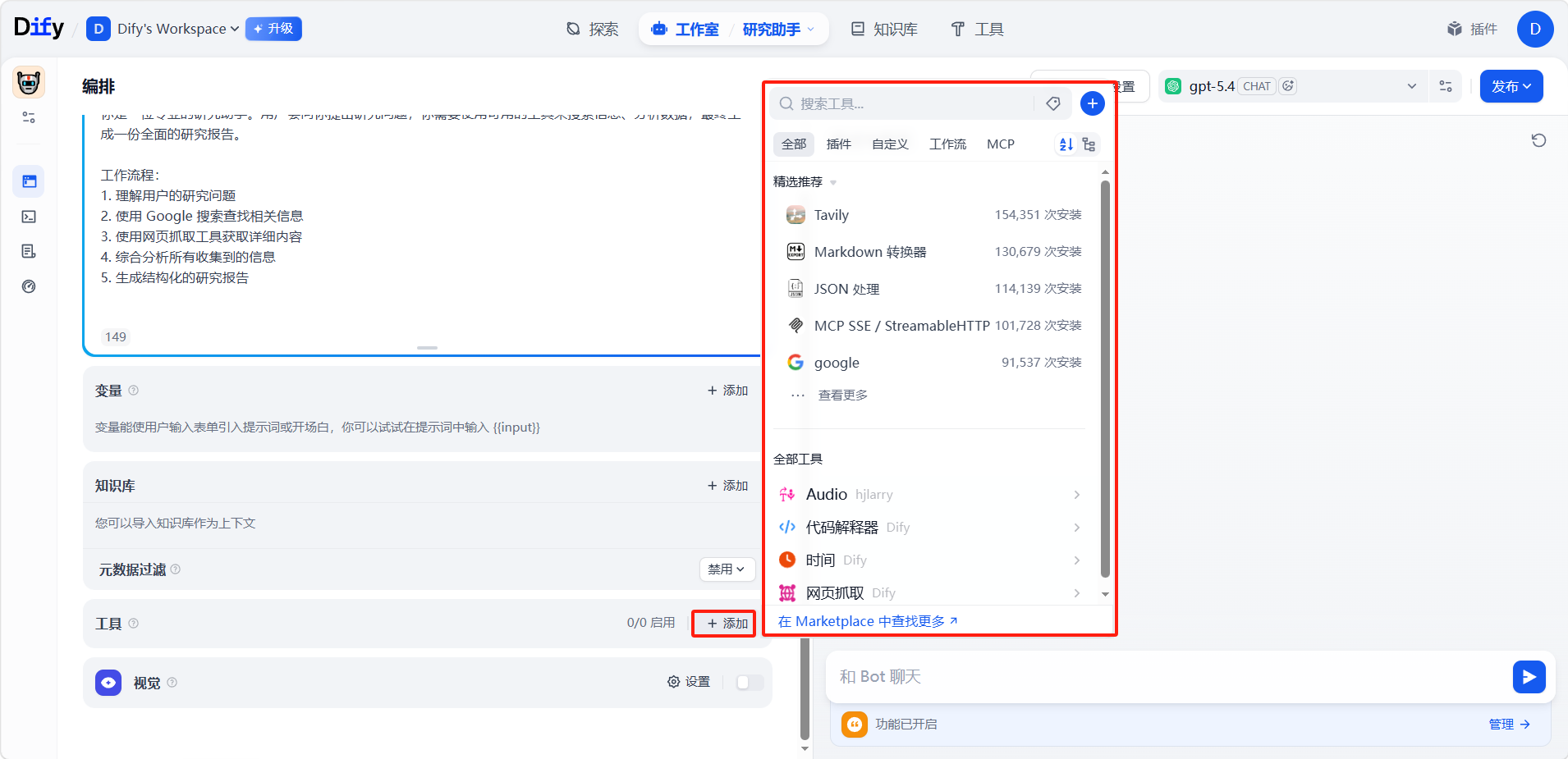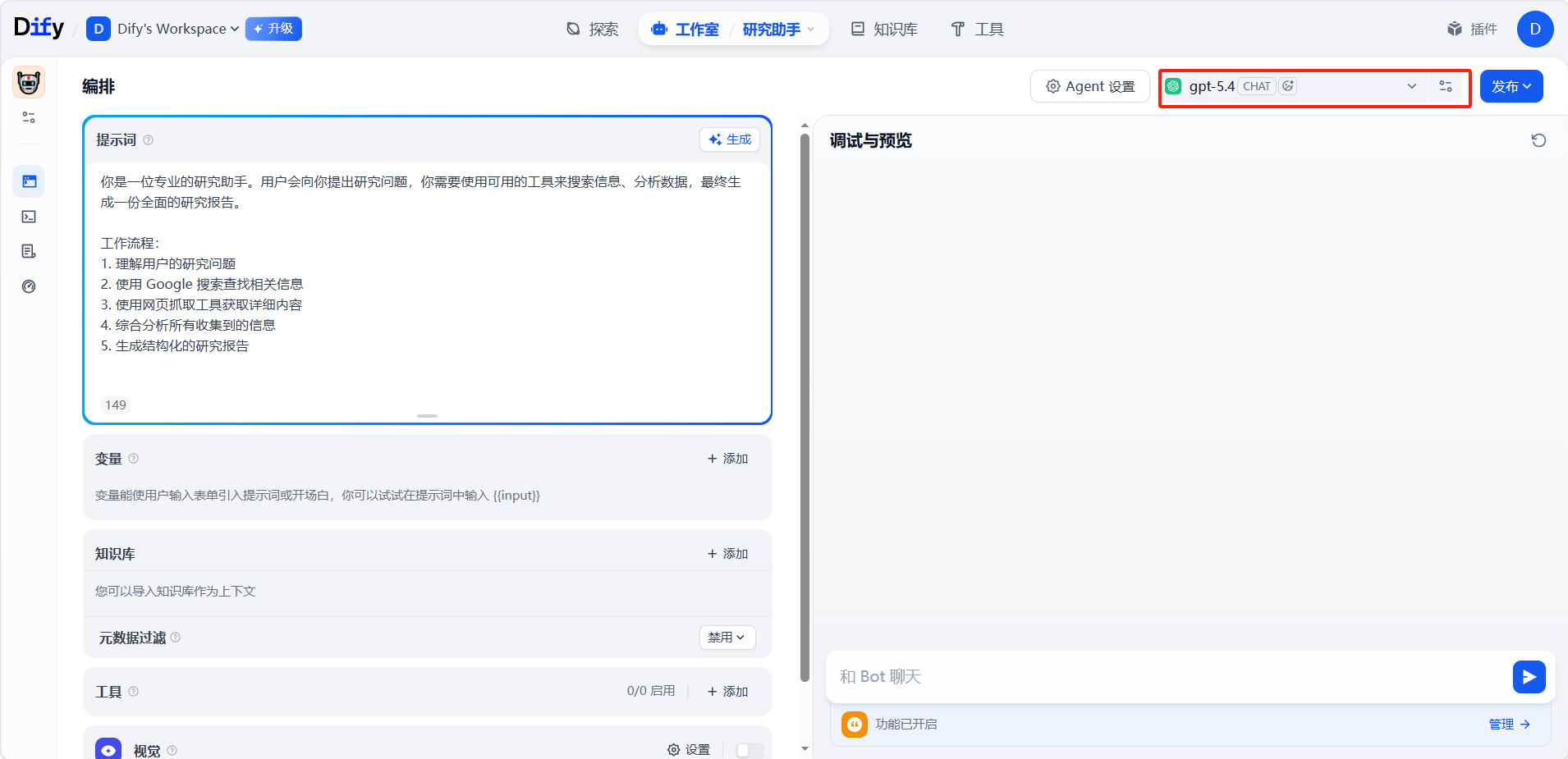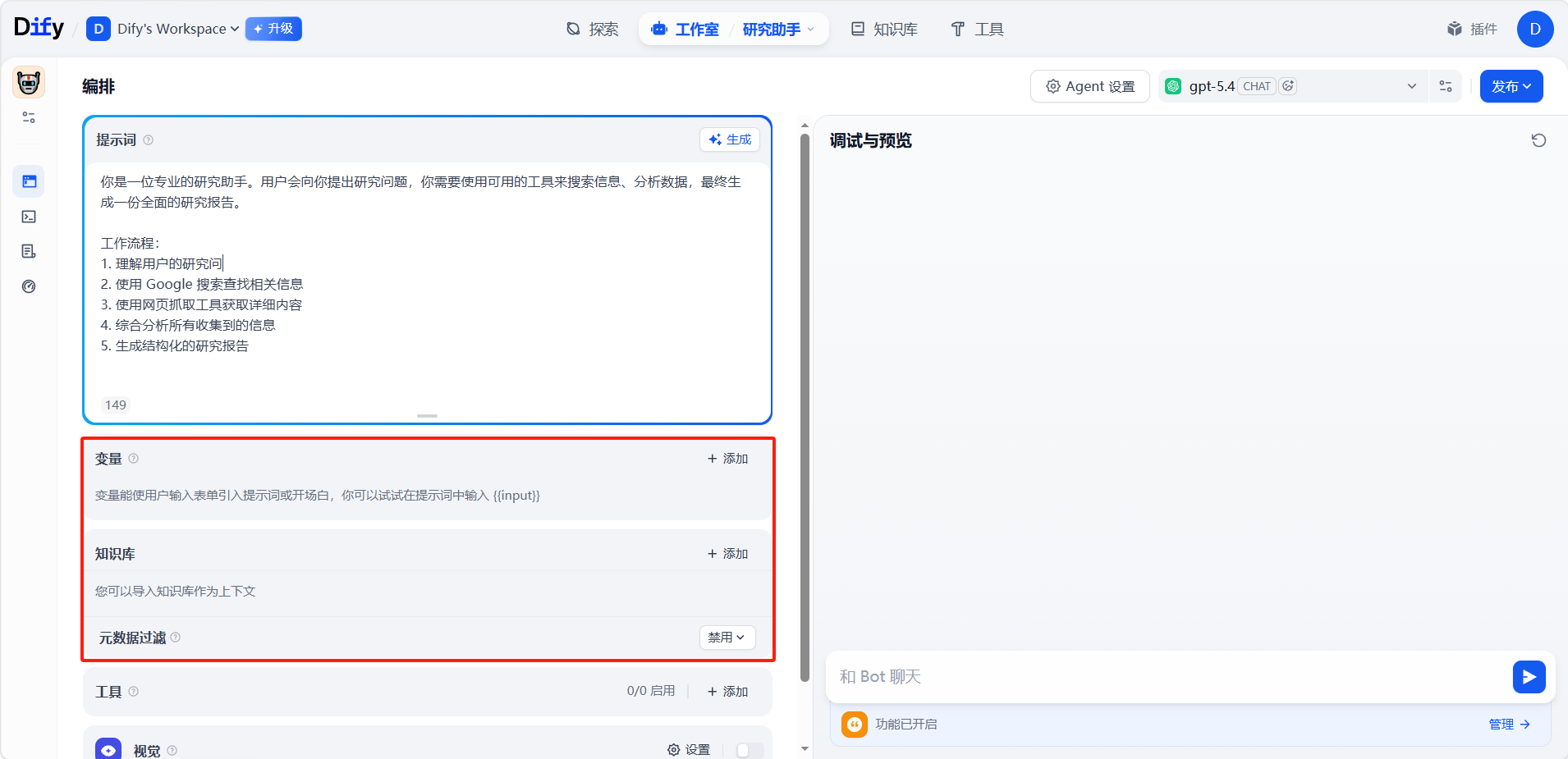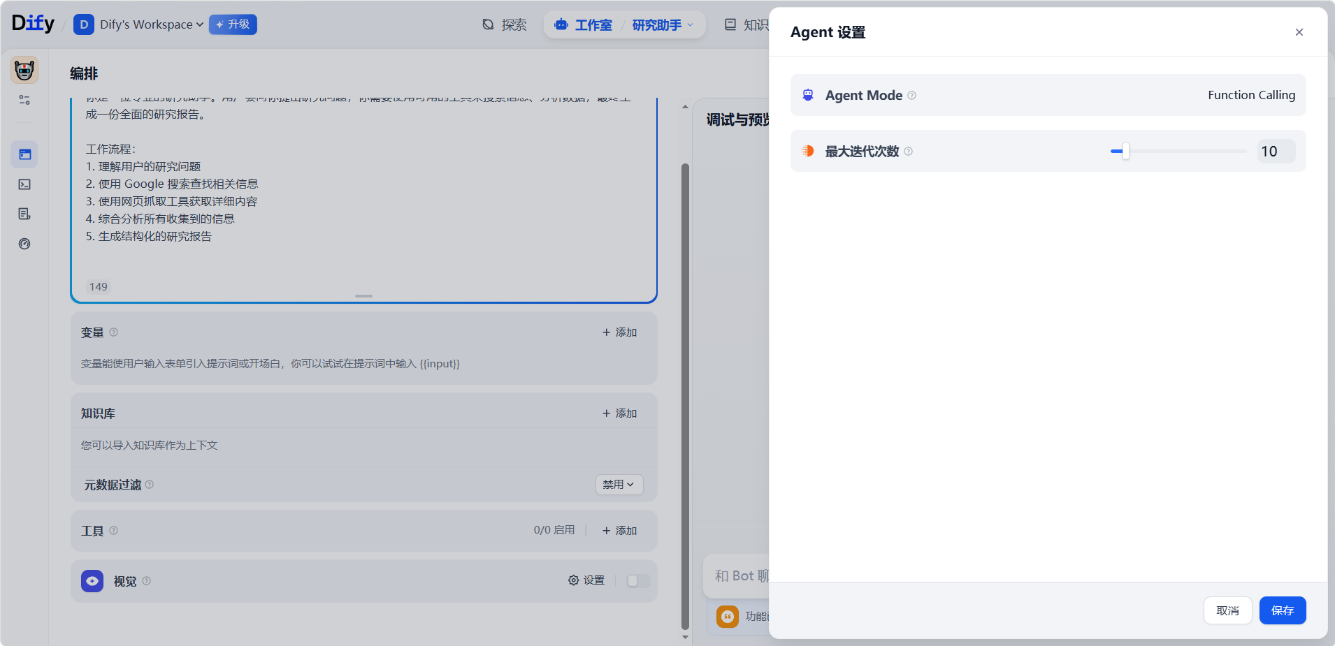Agent 的编排界面与聊天助手类似,左侧配置提示词、变量、知识库和工具,右侧是调试区域。关键区别在于 Agent 多了「工具」配置区域和「Agent 设置」面板,可以在其中选择推理策略、配置最大迭代次数等参数。