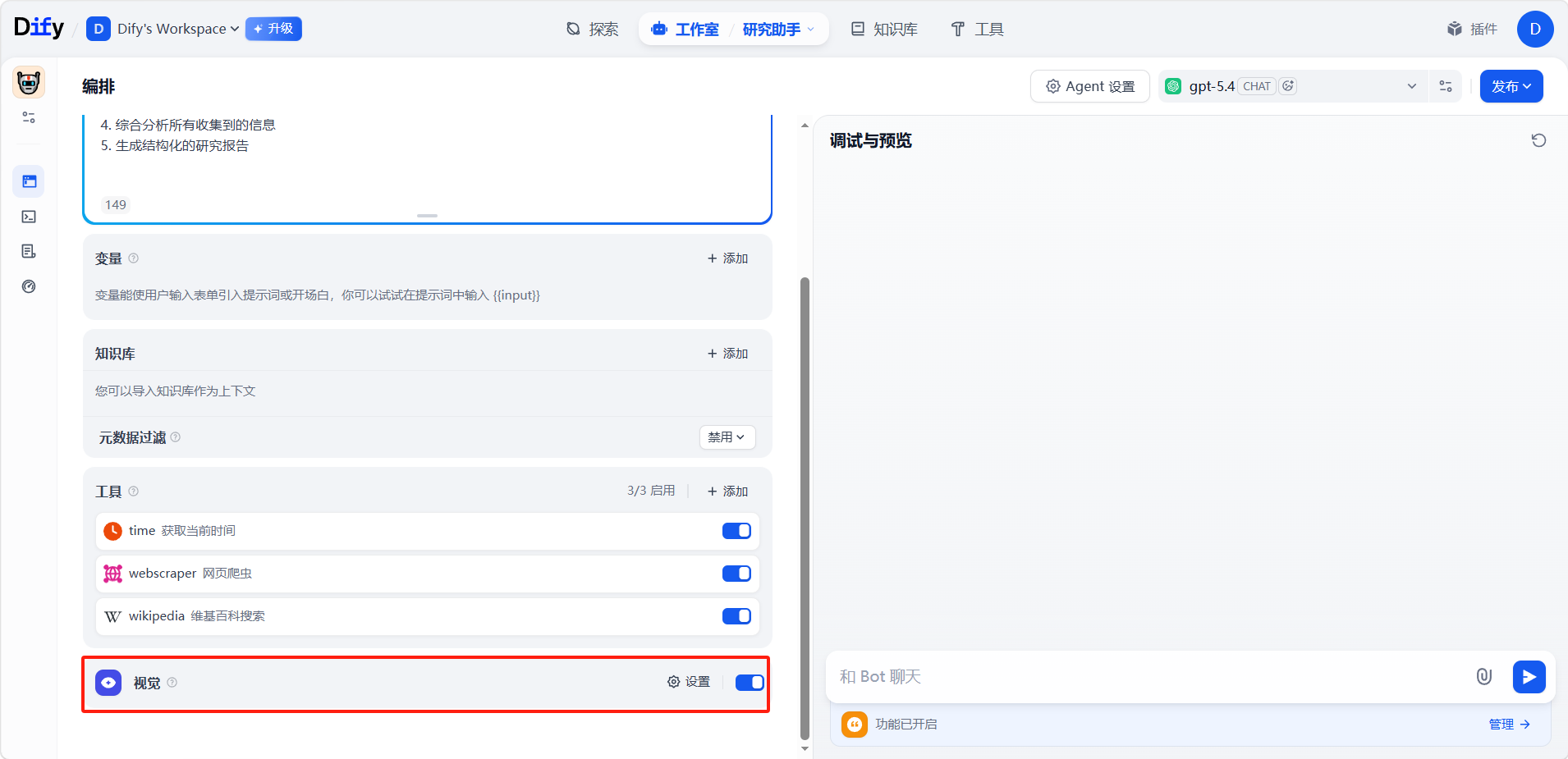 下方的「视觉」选项可以选择智能体是否能接收图片。