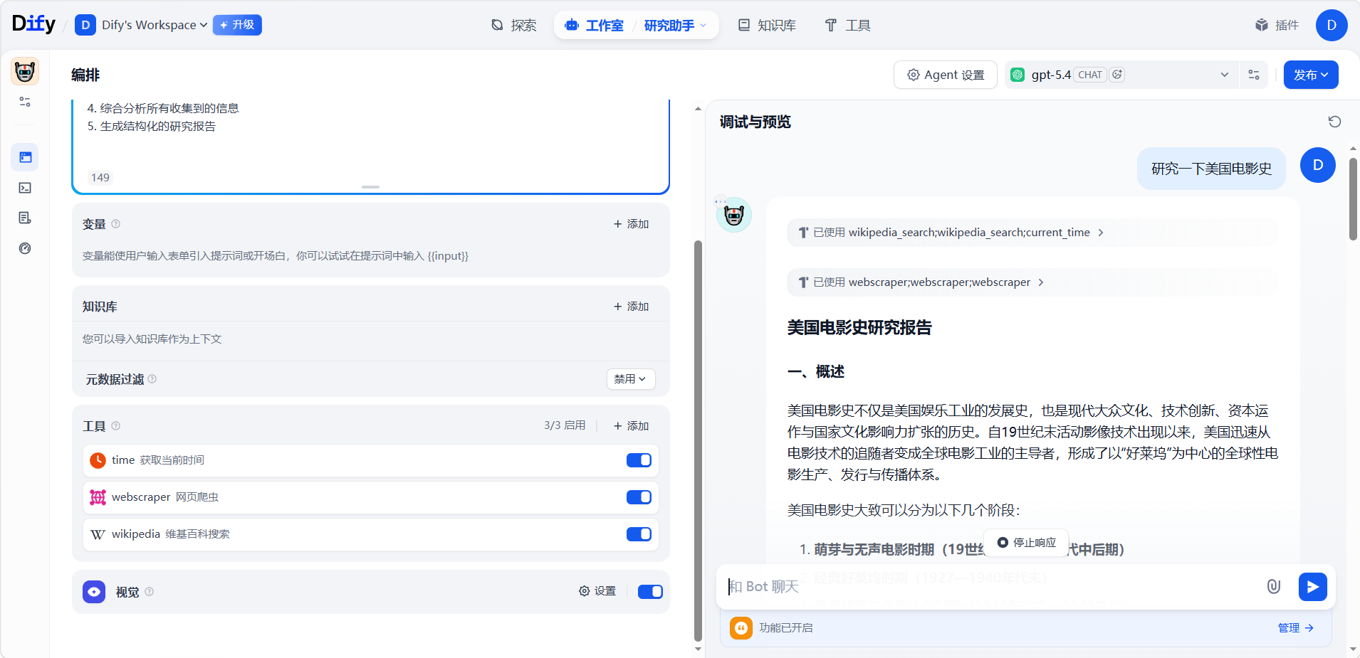 - 如果 Agent 的行为不符合预期,可以在调试区域查看完整的推理链(思考过程和工具调用记录),找出问题所在。