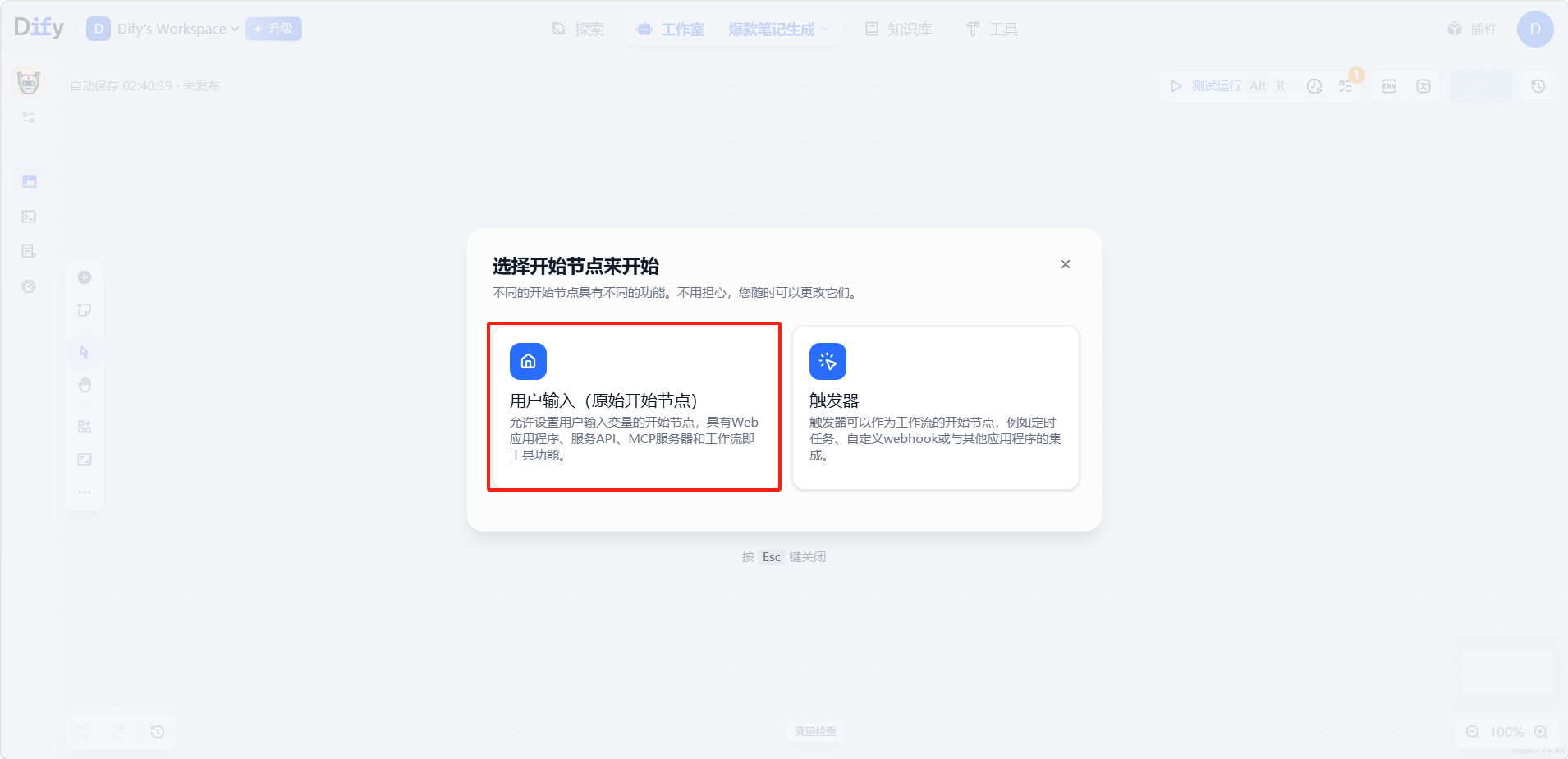 - 选择「用户输入」如果需要手动触发或通过 API 调用。