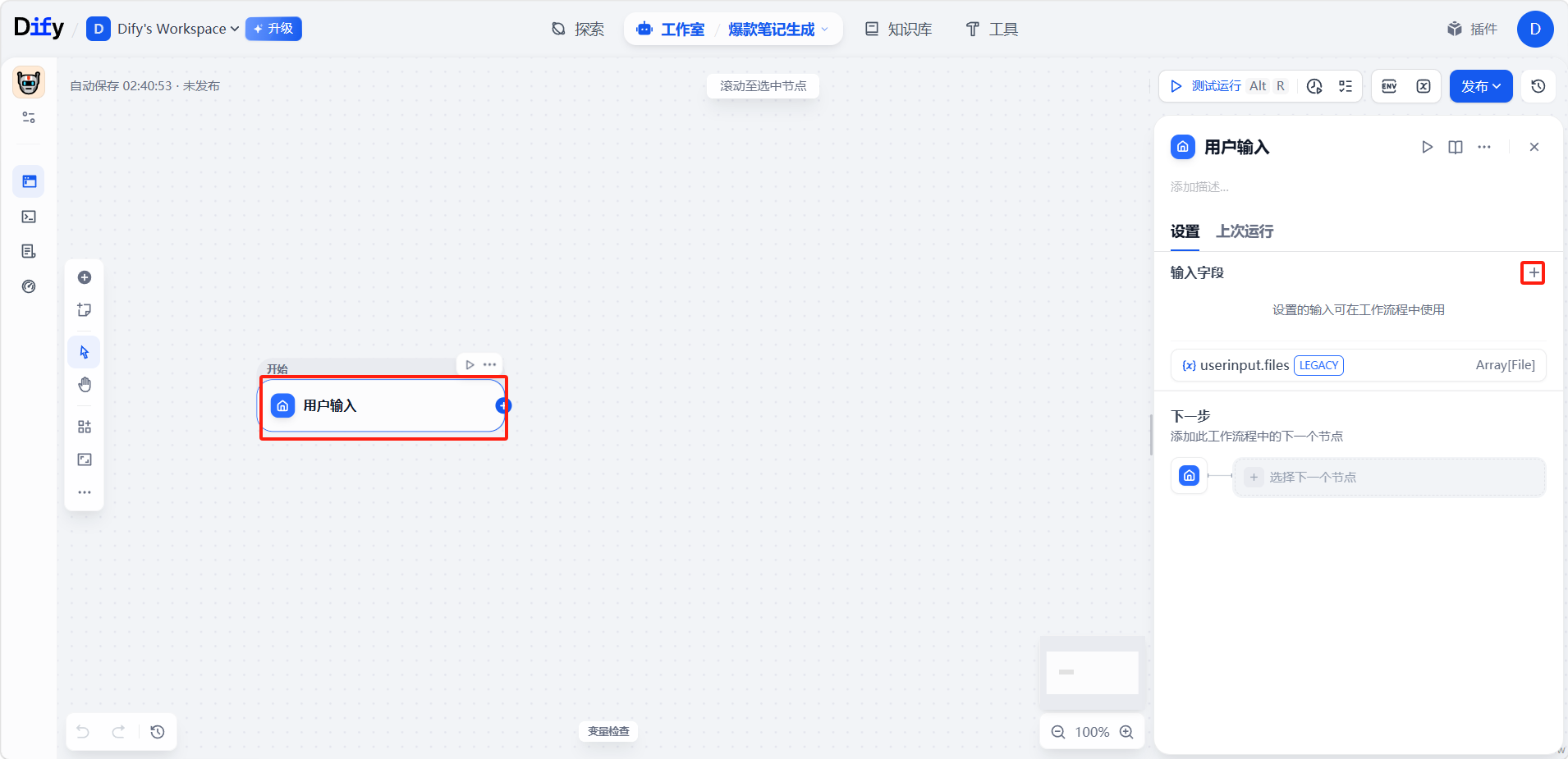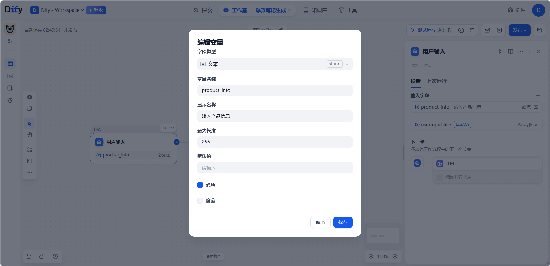 点击开始节点「用户输入」,在编辑界面中定义变量。