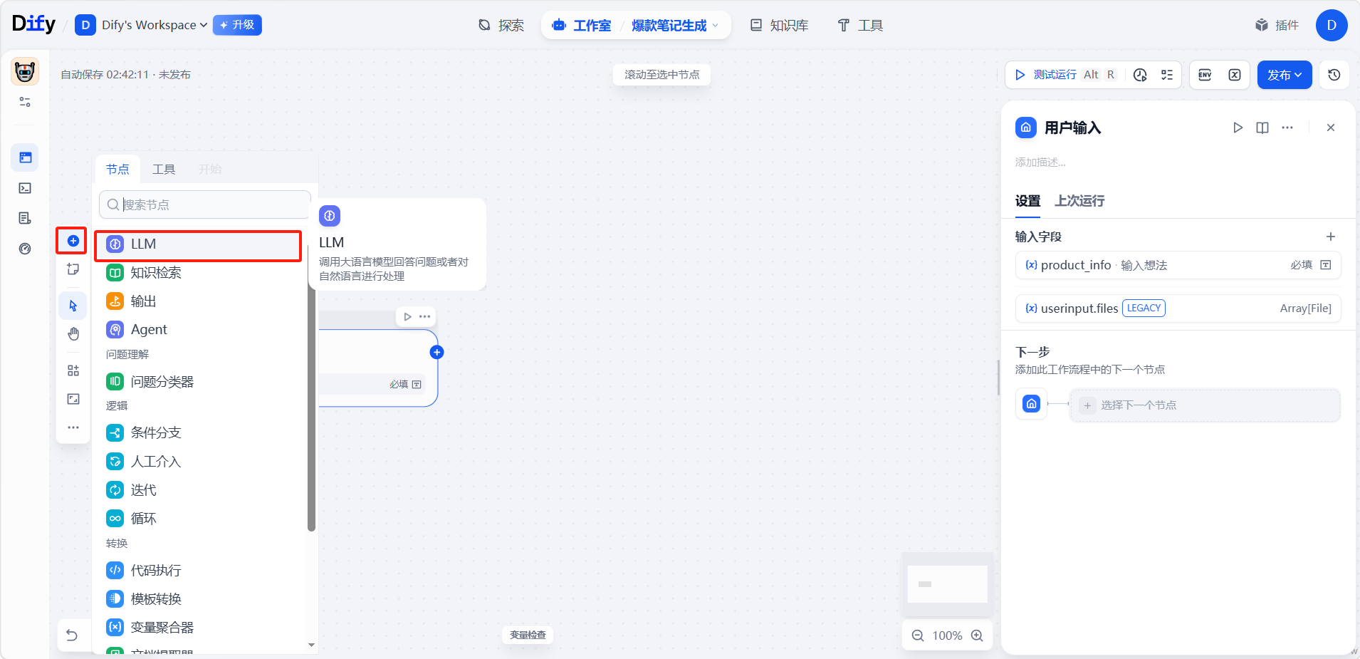 点击左侧添加一个「LLM」节点。