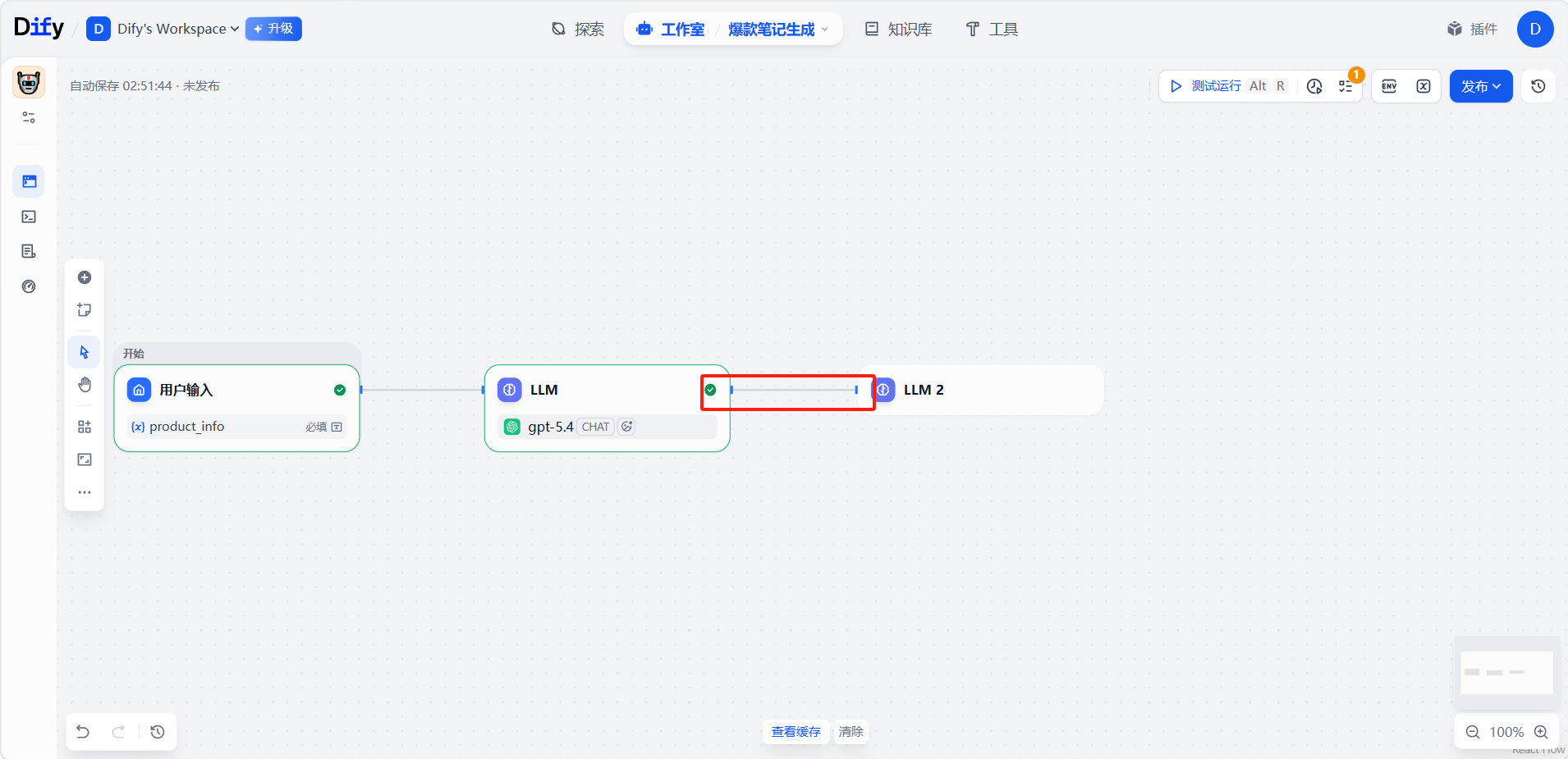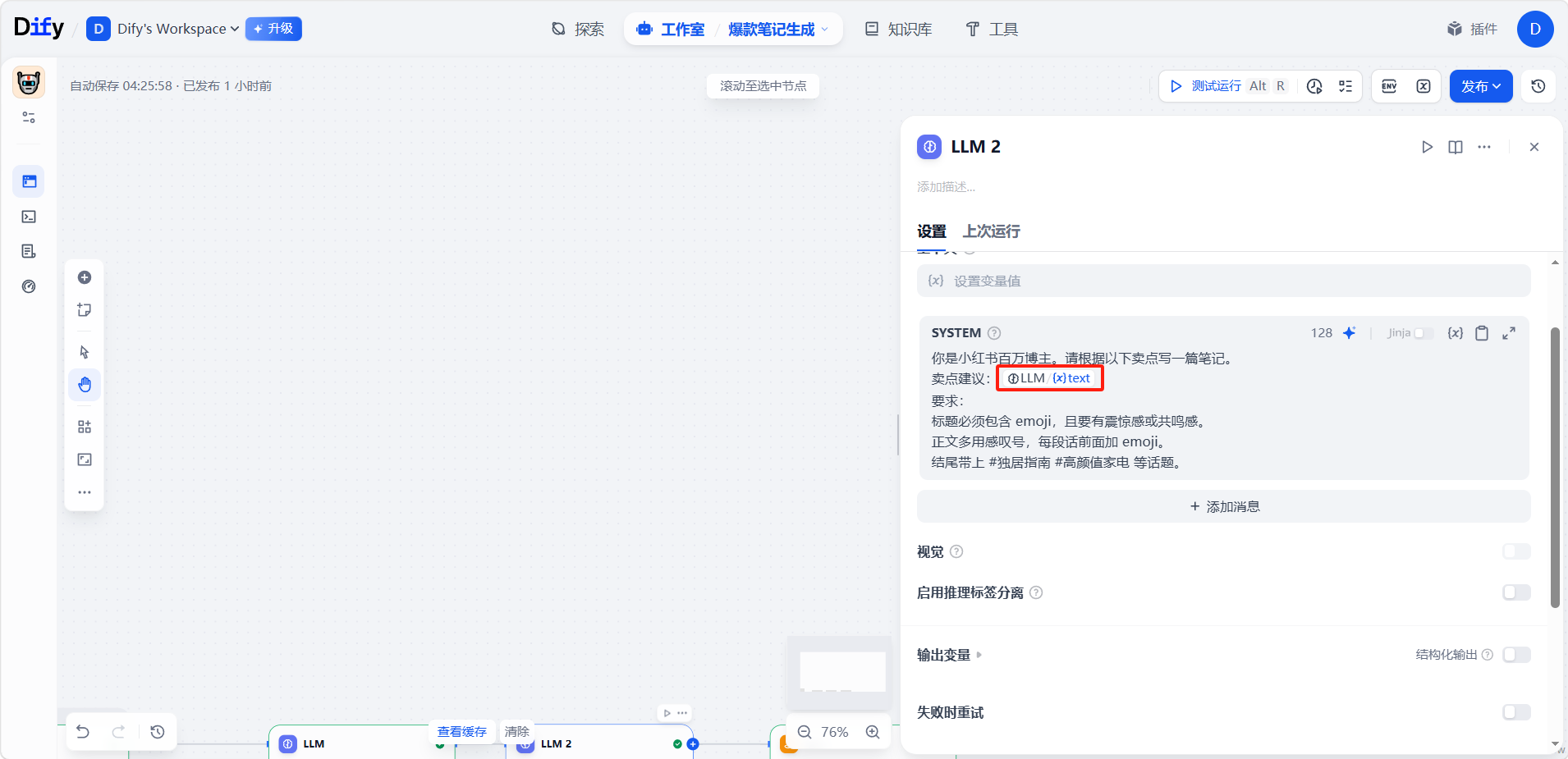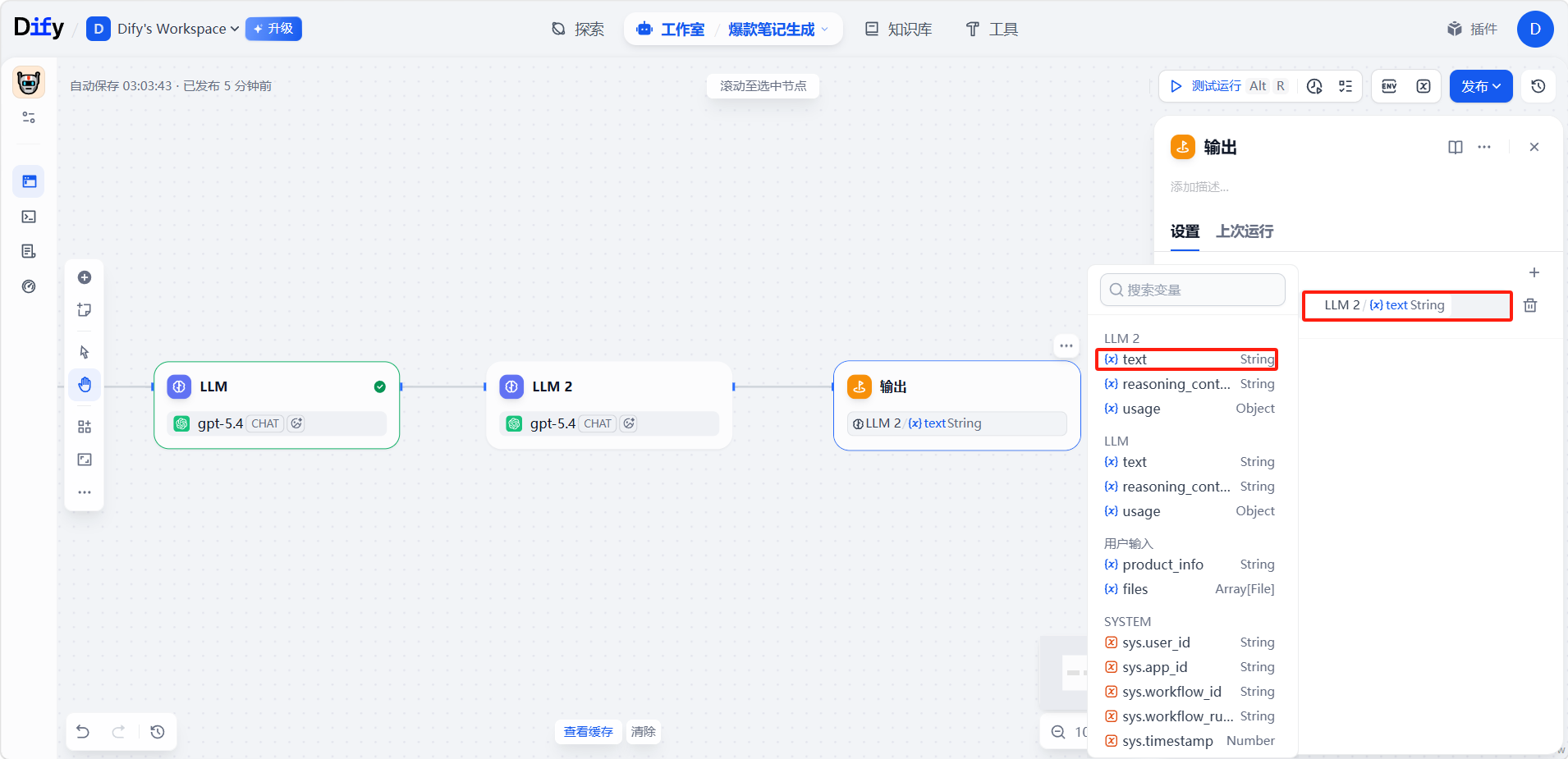 最后添加一个「输出」节点,与「LLM 2」节点连接。