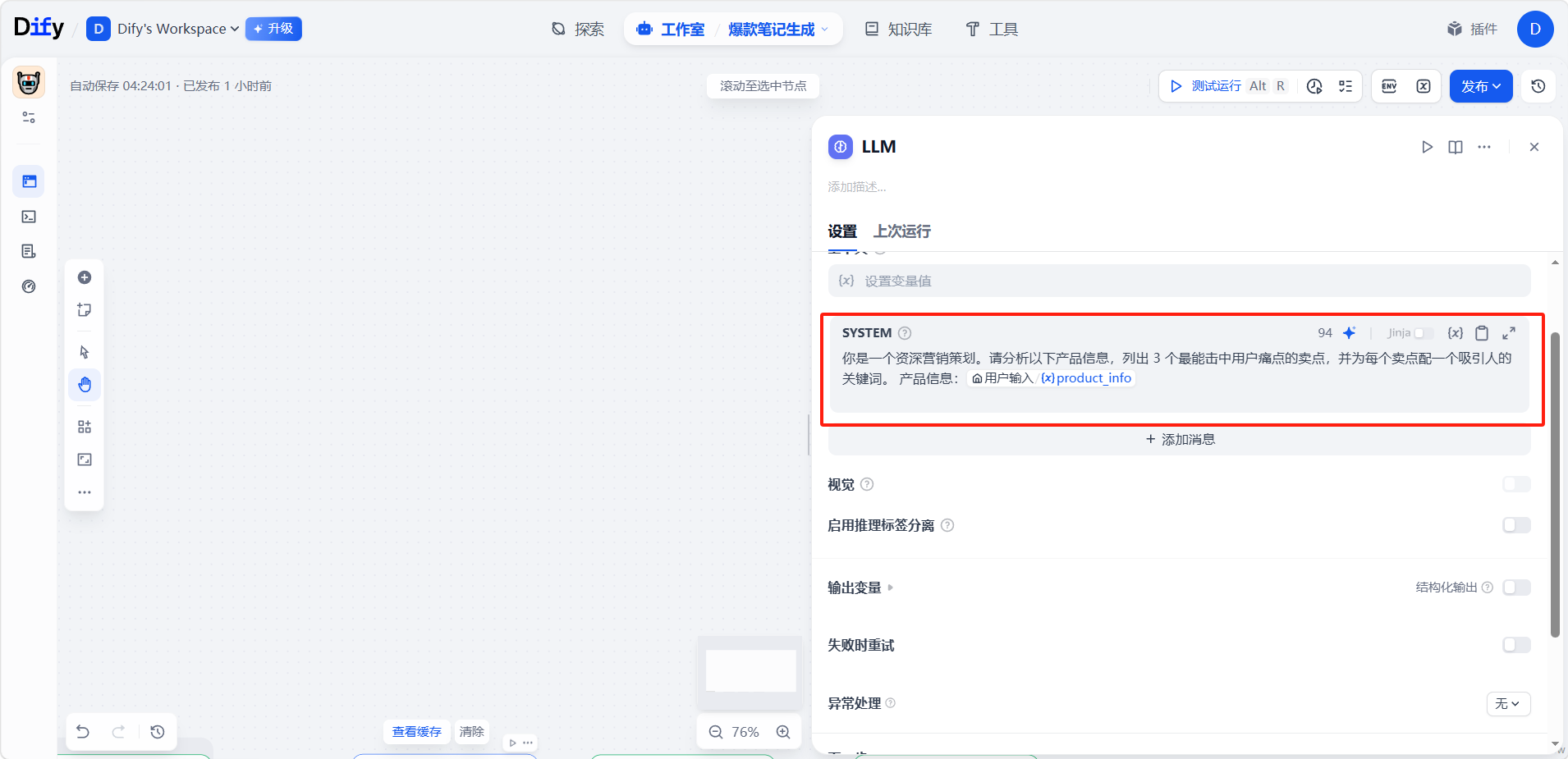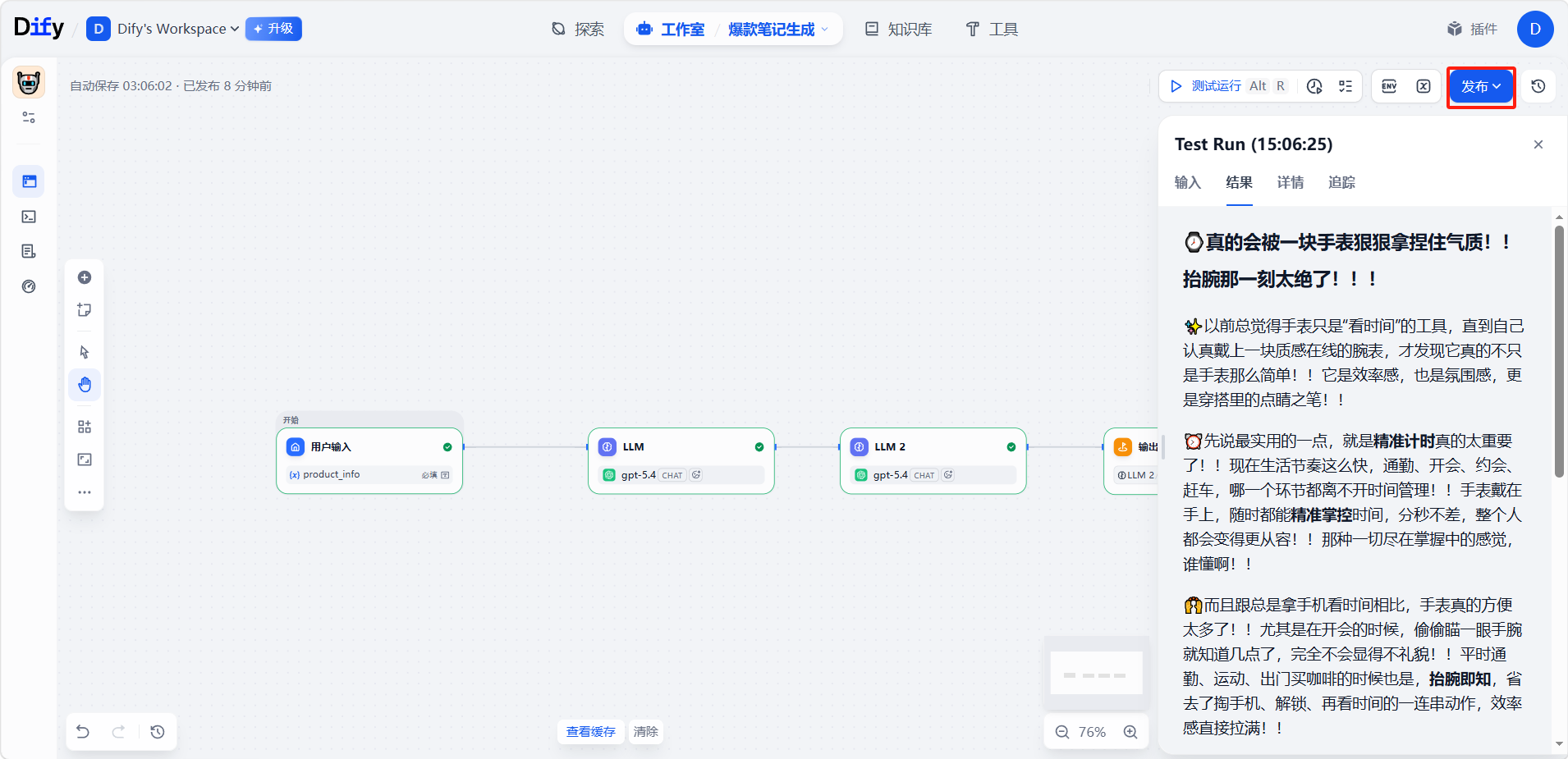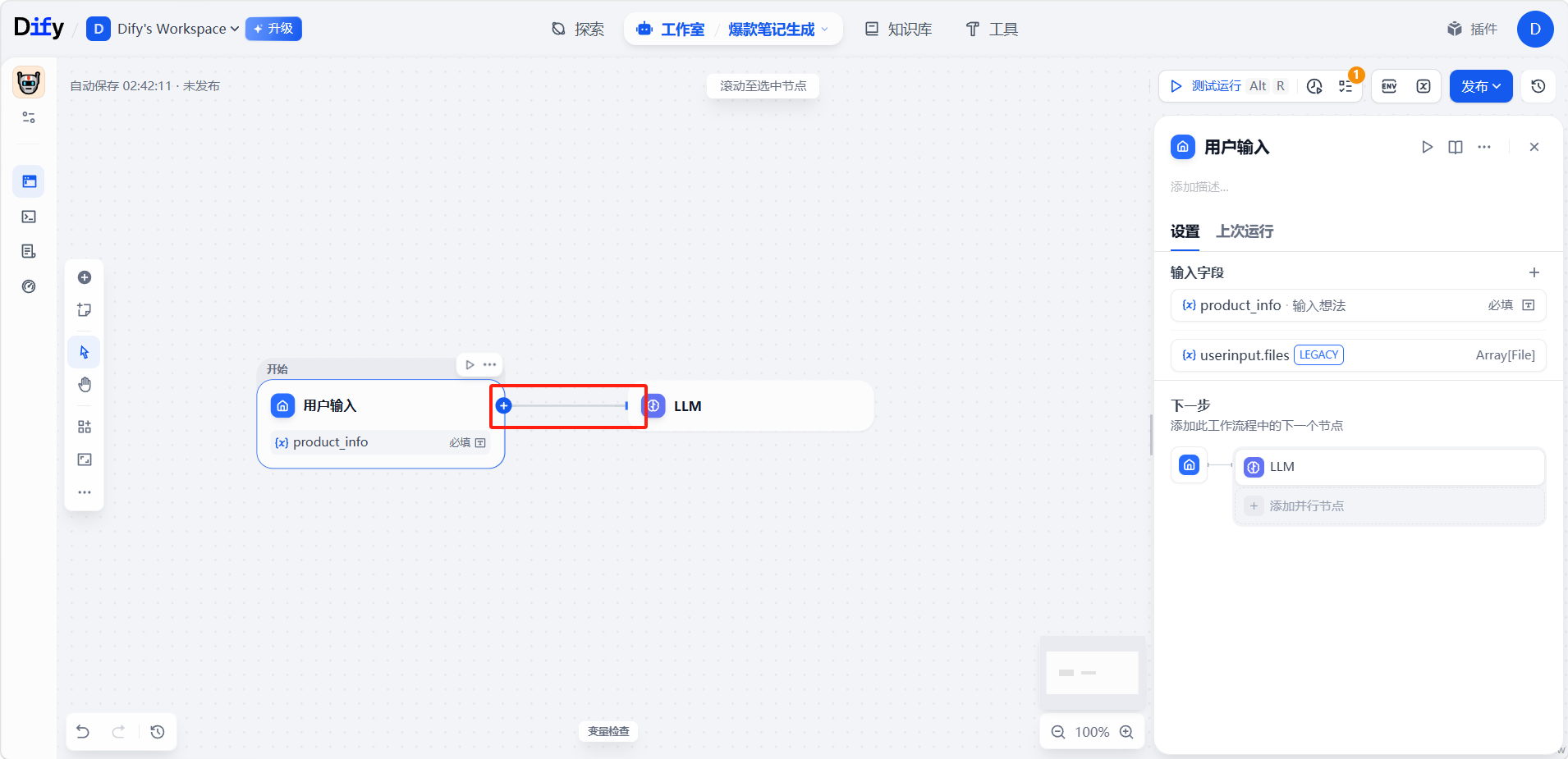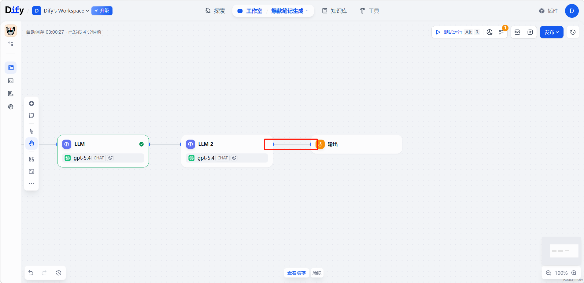 最后添加一个「输出」节点,与「LLM 2」节点连接。