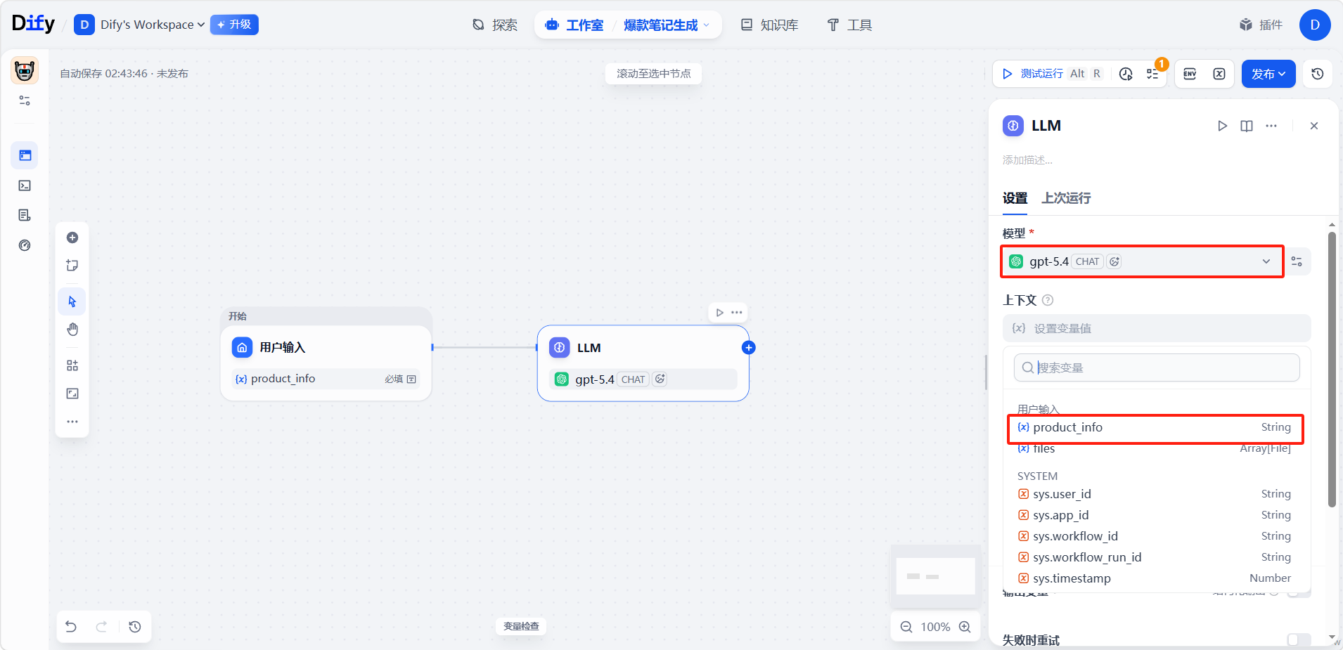 选择LLM节点使用的模型,并且将变量设置为开始节点的用户输入变量。