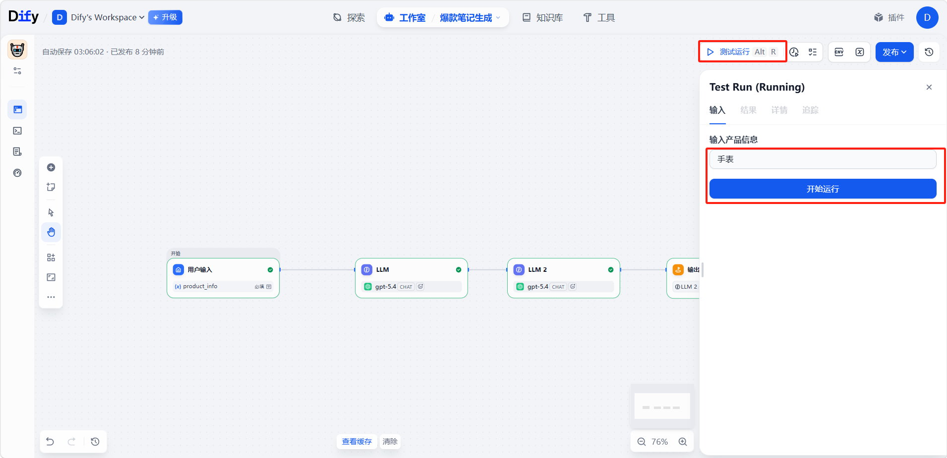 点击右上角「测试运行」测试工作流是否能正常工作。