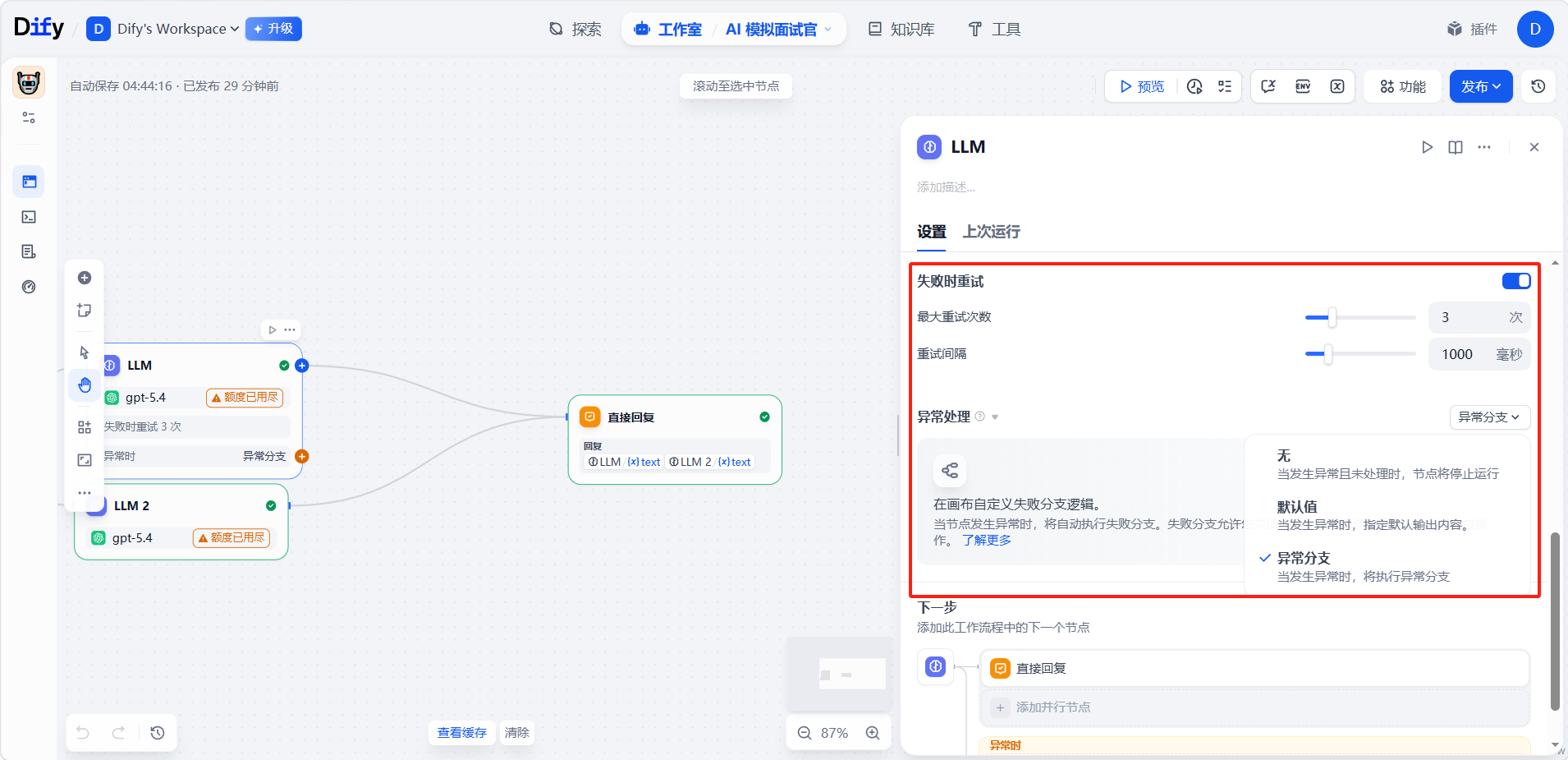 在生产环境中,AI 应用难免会遇到各种异常情况——模型 API 调用超时、外部工具返回错误、知识库检索失败等。Dify 提供了异常处理和错误重试机制,帮助开发者构建更健壮的应用。