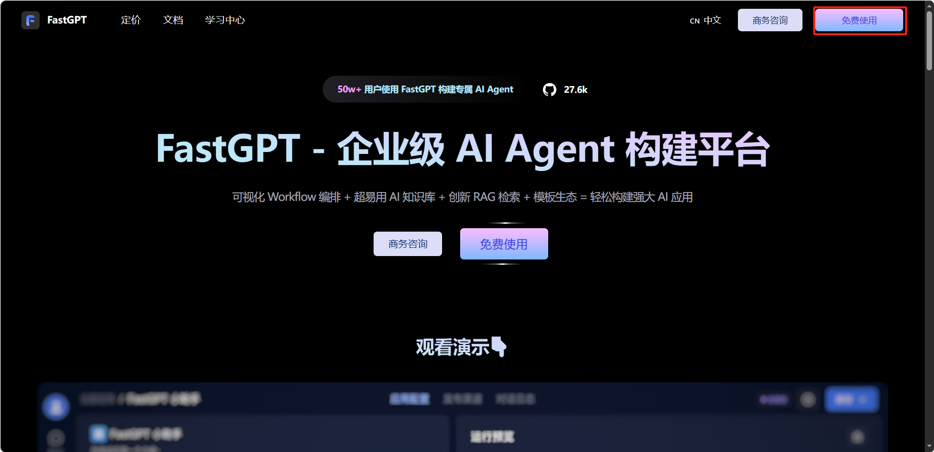 打开浏览器,访问 FastGPT 官方网站 https://fastgpt.cn