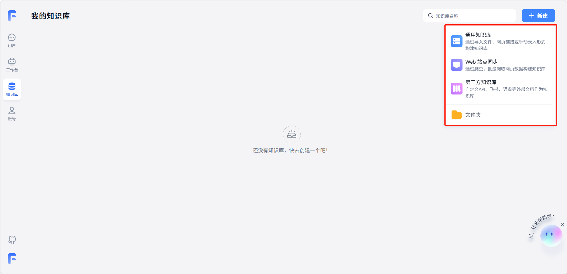 文件夹:用于组织和管理多个知识库,便于分类归档。