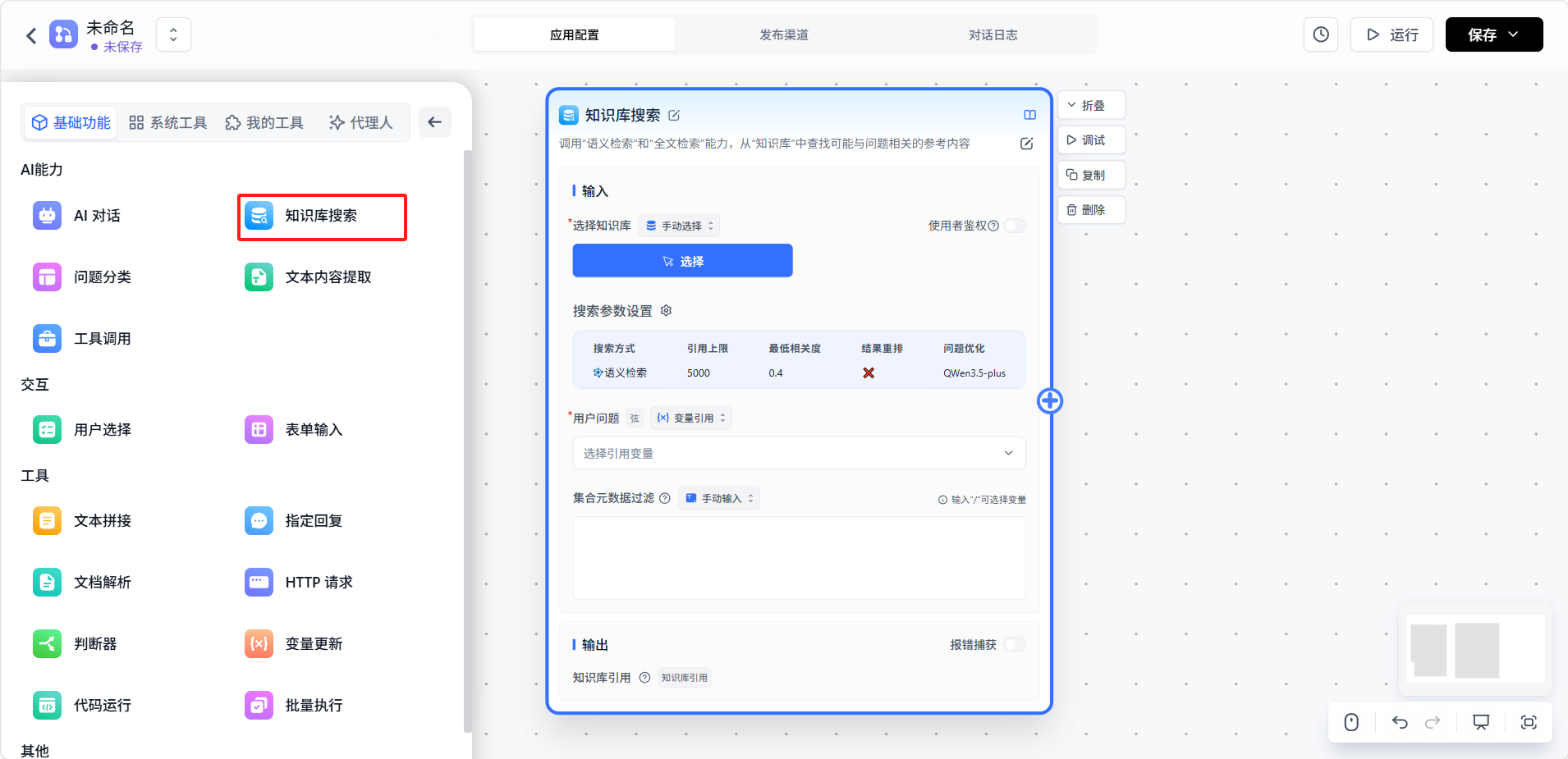 知识库搜索节点负责从指定的知识库中检索与用户问题最相关的文档片段,是实现 RAG(检索增强生成)的关键环节。