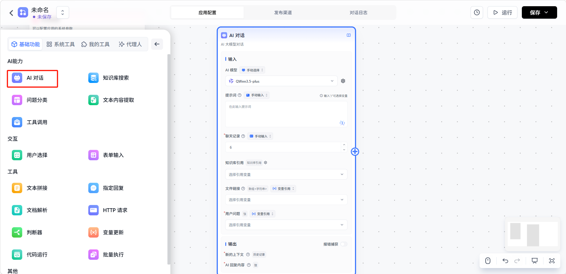 AI 对话是工作流中最核心的节点,负责调用大语言模型进行对话生成。该节点可重复添加,支持触发执行,是构建智能问答应用的基础组件。在 AI 对话模块中,提供了「AI 高级配置」面板,包含模型的各项参数设置。